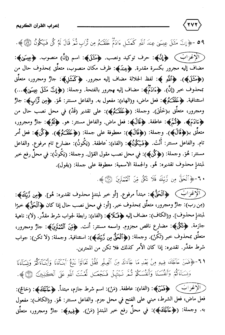مضاف إليه مجرور بكسرة مقدرة. {عِنْدَ}: ظرف مكان منصوب، متعلّق بمحذوف حال من {مَثَلَ}. {اللهِ}: لفظ الجلالة مضاف إليه مجرور. {كَمَثَلِ}: جارّ ومجرور، متعلّق بمحذوف خبر (إنّ). {آدَمَ}: مضاف إليه مجرور بالفتحة. وجملة: {إِنَّ مَثَلَ عِيسى ... } استئنافية. {خَلَقَهُ}: فعل ماض، و (الهاء): مفعول به. والفاعل مستتر: هو. {مِنْ تُرابٍ}: جارّ ومجرور، متعلّق ب (خلق).وجملة: {خَلَقَهُ}: على تقدير (قد) في محل نصب حال من {آدَمَ}. {ثُمَّ}: عاطفة. {قالَ}: فعل ماض. والفاعل مستتر: هو. {لَهُ}: جارّ ومجرور، متعلّق ب {قالَ}. وجملة: {قالَ}: معطوفة على جملة: {خَلَقَهُ}. {كُنْ}: فعل أمر تام. والفاعل مستتر: أنت. {فَيَكُونُ}: (الفاء): عاطفة. (يكون): مضارع تام مرفوع. والفاعل مستتر: هو. وجملة: {كُنْ}: في محل نصب مقول القول. وجملة: (يكون): في محلّ رفع خبر لمبتدإ محذوف تقديره: هو. والجملة الاسمية: معطوفة على جملة: (يقول).