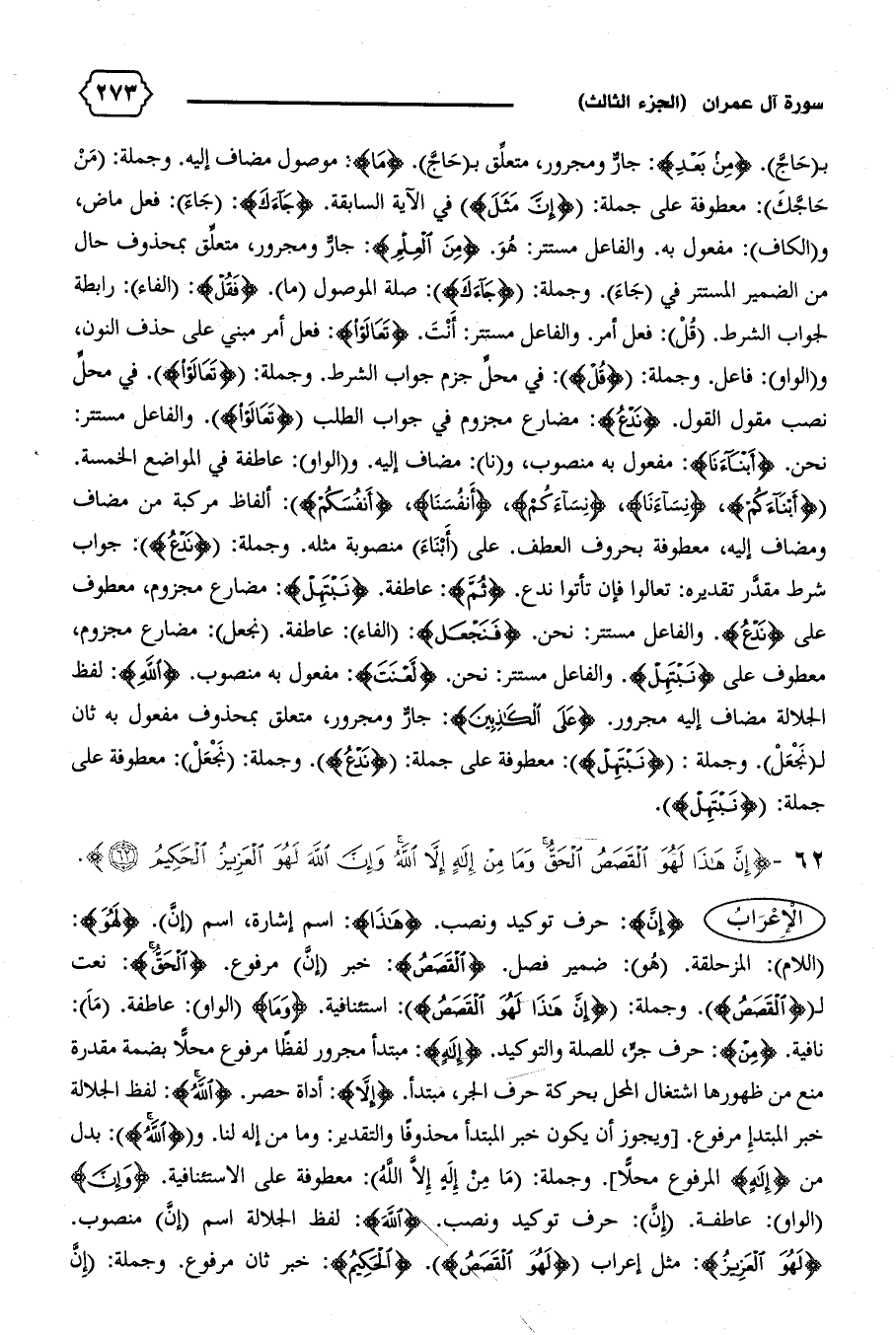 (اللام): المزحلقة. (هو): ضمير فصل. {الْقَصَصُ}: خبر (إنّ) مرفوع. {الْحَقُّ}: نعت ل {الْقَصَصُ}. وجملة: {إِنَّ هذا لَهُوَ الْقَصَصُ}: استئنافية. {وَما} (الواو): عاطفة. (ما):