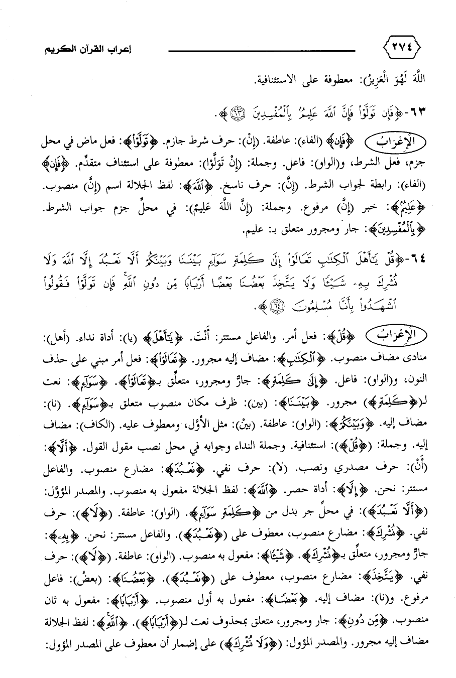 منادى مضاف منصوب. {الْكِتابِ}: مضاف إليه مجرور. {تَعالَوْا}: فعل أمر مبني على حذف النون، و (الواو): فاعل. {إِلى كَلِمَةٍ}: جارّ ومجرور، متعلّق ب {تَعالَوْا}. {سَواءٍ}: نعت ل {كَلِمَةٍ} مجرور. {بَيْنَنا}: (بين): ظرف مكان منصوب متعلق ب {سَواءٍ}. (نا):
