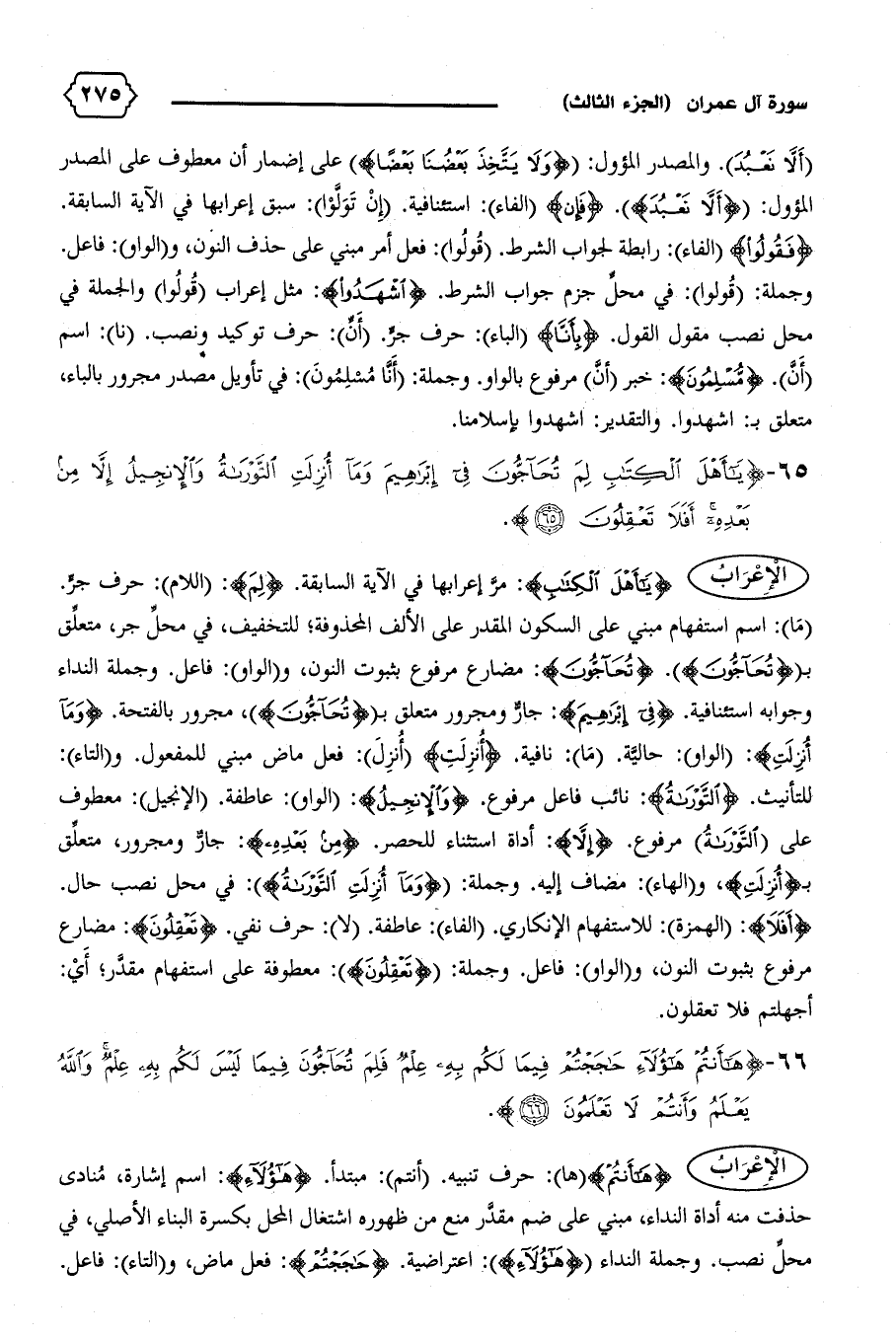(ما): اسم استفهام مبني على السكون المقدر على الألف المحذوفة؛ للتخفيف، في محلّ جر، متعلّق ب {تُحَاجُّونَ}. {تُحَاجُّونَ}: مضارع مرفوع بثبوت النون، و (الواو): فاعل. وجملة النداء وجوابه استئنافية. {فِي إِبْراهِيمَ}: جارّ ومجرور متعلق ب {تُحَاجُّونَ)،} مجرور بالفتحة. {وَما أُنْزِلَتِ}: (الواو): حاليّة. (ما): نافية. {أُنْزِلَتِ} (أنزل): فعل ماض مبني للمفعول. و (التاء):
