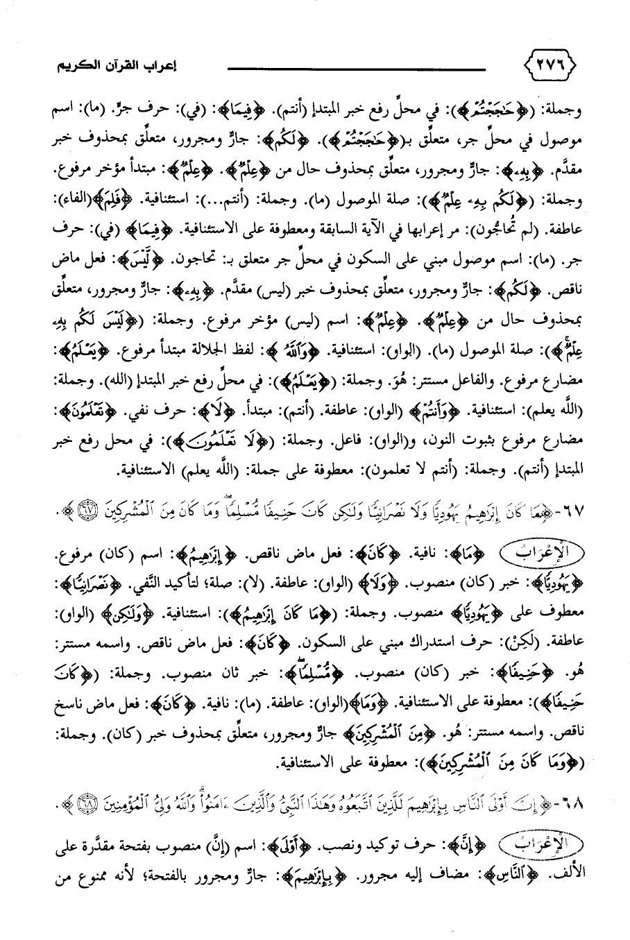 هو. {حَنِيفاً}: خبر (كان) منصوب. {مُسْلِماً}: خبر ثان منصوب. وجملة: {كانَ حَنِيفاً}: معطوفة على الاستئنافية. {وَما} (الواو): عاطفة. (ما): نافية. {كانَ}: فعل ماض ناسخ ناقص. واسمه مستتر: هو. {مِنَ الْمُشْرِكِينَ} جارّ ومجرور، متعلّق بمحذوف خبر (كان).وجملة: