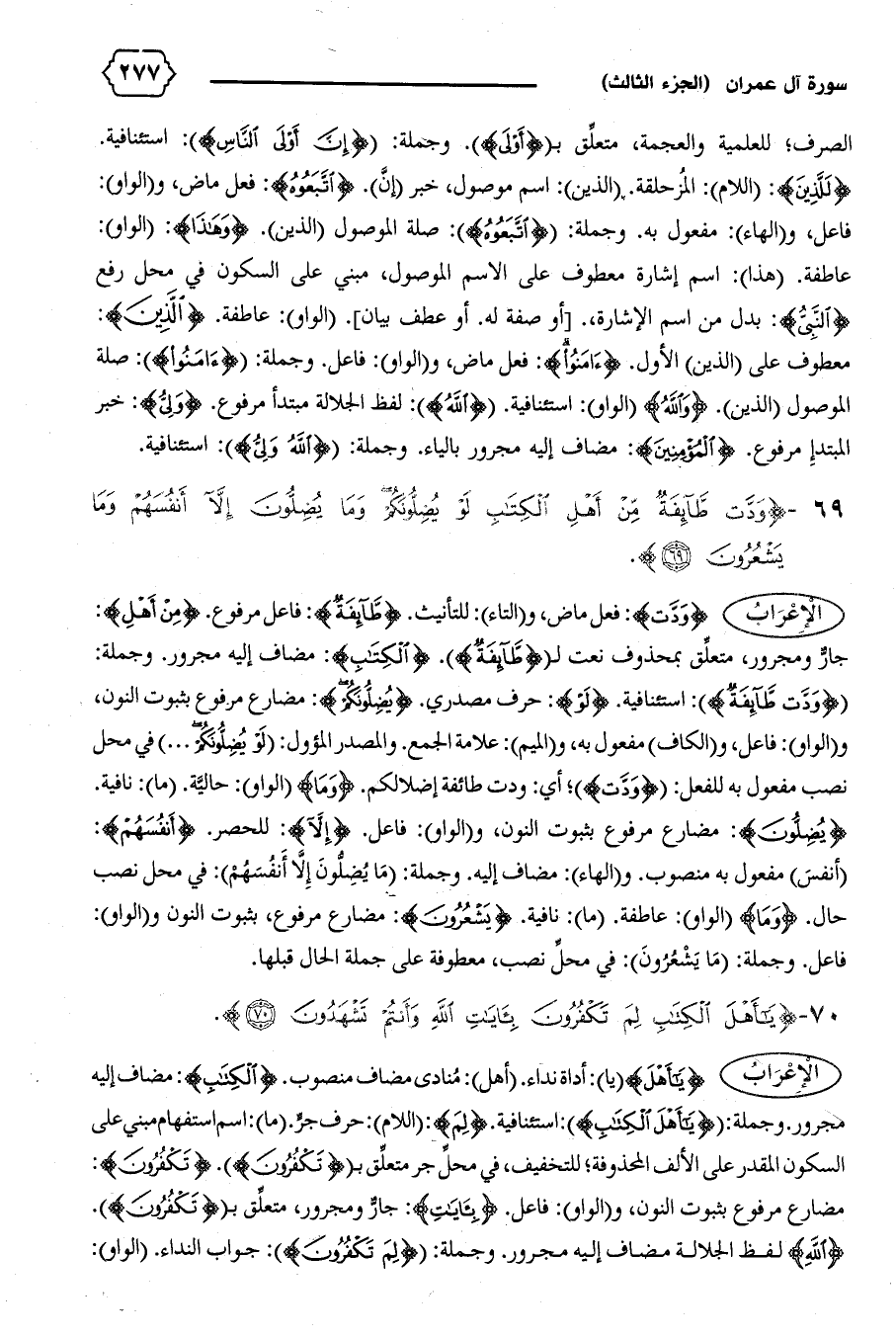 {يا أَهْلَ} (يا): أداة نداء. (أهل): منادى مضاف منصوب. {الْكِتابِ}: مضاف إليه مجرور. وجملة: {يا أَهْلَ الْكِتابِ}: استئنافية. {لِمَ}: (اللام): حرف جرّ. (ما): اسم استفهام مبني على السكون المقدر على الألف المحذوفة؛ للتخفيف، في محلّ جر متعلّق ب {تَكْفُرُونَ}. {تَكْفُرُونَ}:
