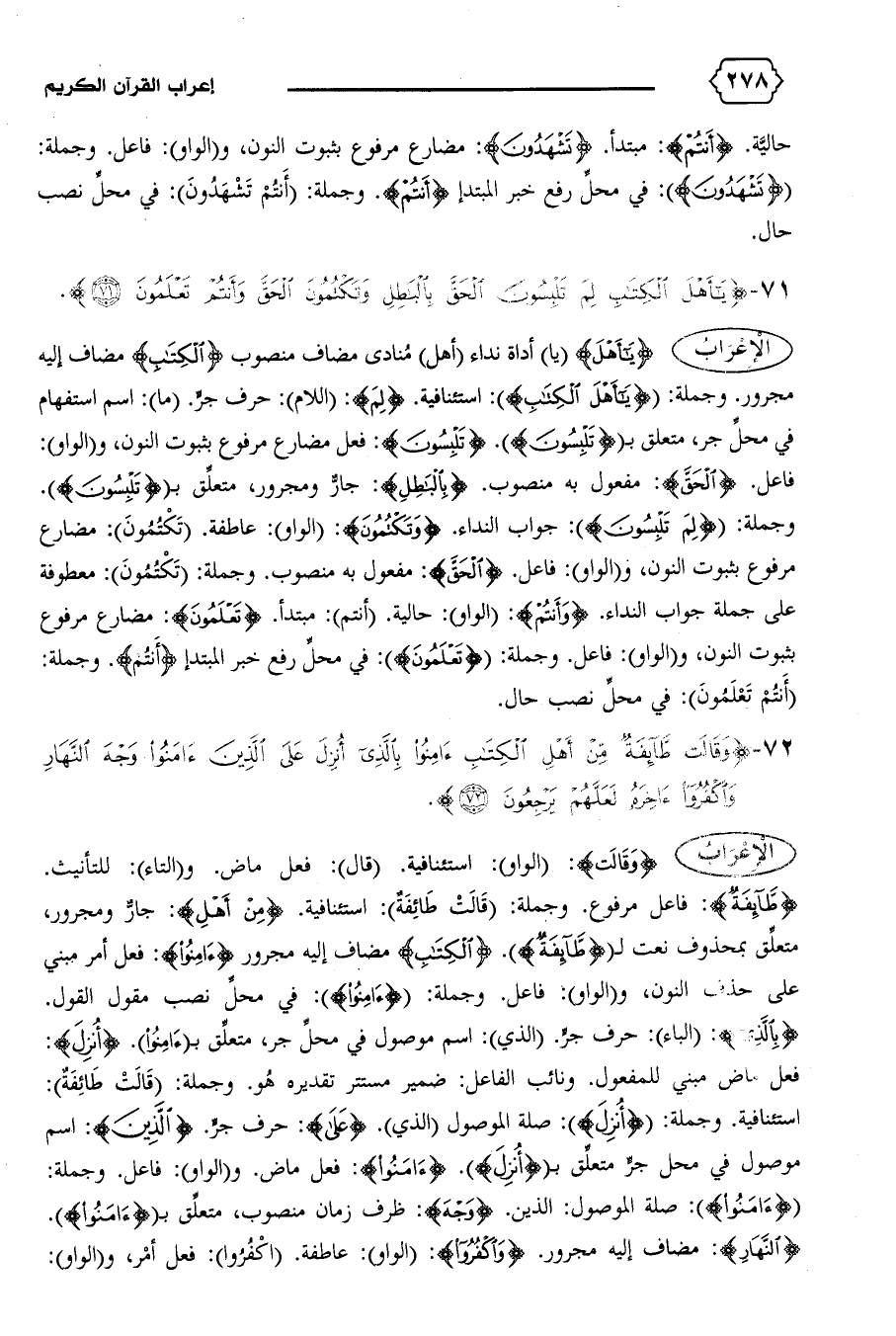 {يا أَهْلَ} (يا) أداة نداء (أهل) منادى مضاف منصوب {الْكِتابِ} مضاف إليه مجرور. وجملة: {يا أَهْلَ الْكِتابِ}: استئنافية. {لِمَ}: (اللام): حرف جرّ. (ما): اسم استفهام في محلّ جر، متعلق ب {تَلْبِسُونَ}. {تَلْبِسُونَ}: فعل مضارع مرفوع بثبوت النون، و (الواو):
