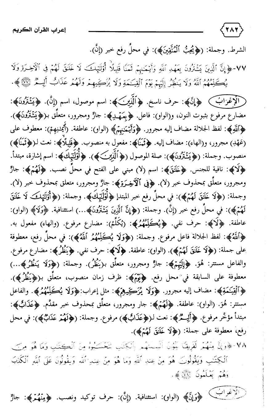 وجملة: {لا خَلاقَ لَهُمْ}: في محلّ رفع خبر المبتدإ {أُولئِكَ}. وجملة: {أُولئِكَ لا خَلاقَ لَهُمْ}: في محلّ رفع خبر (إنّ).وجملة: {إِنَّ الَّذِينَ يَشْتَرُونَ ... } استئنافية. {وَلا} (الواو):