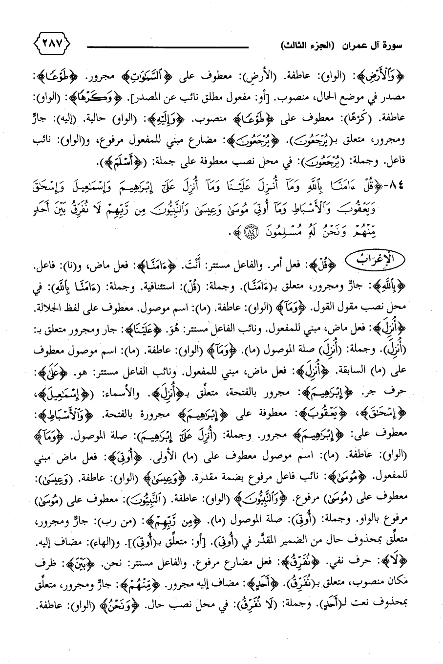 عاطفة. (كرها): معطوف على {طَوْعاً} منصوب. {وَإِلَيْهِ}: (الواو) حالية. (إليه): جارّ ومجرور، متعلق ب (يرجعون). {يُرْجَعُونَ}: مضارع مبني للمفعول مرفوع، و (الواو): نائب فاعل. وجملة: (يرجعون): في محل نصب معطوفة على جملة: {أَسْلَمَ}.