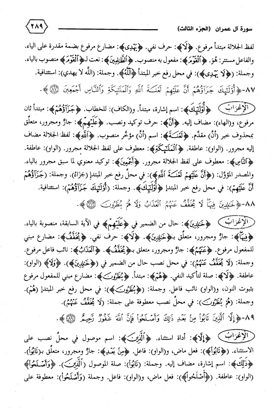 {أُولئِكَ}: اسم إشارة، مبتدأ. و (الكاف): للخطاب. {جَزاؤُهُمْ}: مبتدأ ثان مرفوع، و (الهاء): مضاف إليه. {أَنَّ}: حرف توكيد ونصب. {عَلَيْهِمْ}: جارّ ومجرور، متعلّق بمحذوف خبر (أنّ) مقدّم. {لَعْنَةَ}: اسم (أنّ) مؤخّر منصوب. {اللهِ}: لفظ الجلالة مضاف إليه مجرور. (الواو): عاطفة. {الْمَلائِكَةِ}: معطوف على لفظ الجلالة مجرور. (الواو): عاطفة.