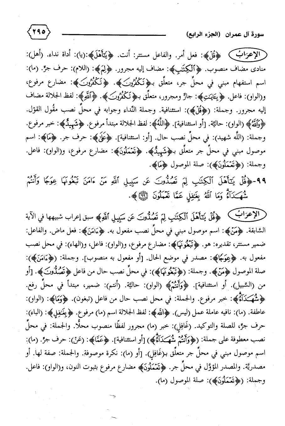 {قُلْ يا أَهْلَ الْكِتابِ لِمَ تَصُدُّونَ عَنْ سَبِيلِ اللهِ} سبق إعراب شبيهها في الآية السّابقة. {مَنْ}: اسم موصول مبني في محلّ نصب مفعول به. {آمَنَ}: فعل ماض. والفاعل: