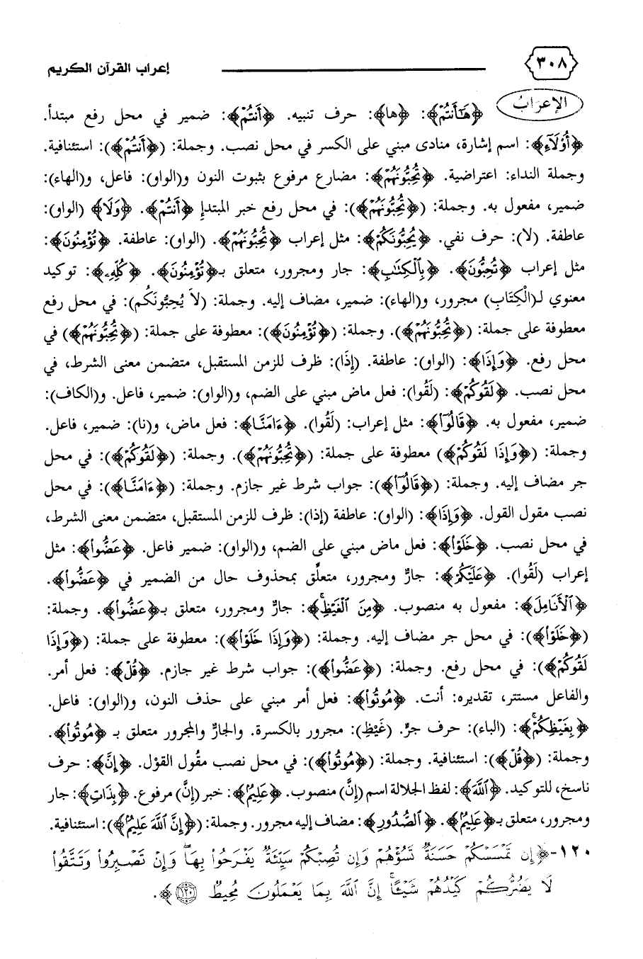مثل إعراب {تُحِبُّونَ}. {بِالْكِتابِ}: جار ومجرور، متعلق ب {تُؤْمِنُونَ}. {كُلِّهِ}: توكيد معنوي ل (الكتاب) مجرور، و (الهاء): ضمير، مضاف إليه. وجملة: (لا يحبّونكم): في محل رفع معطوفة على جملة: {تُحِبُّونَهُمْ}. وجملة: {تُؤْمِنُونَ}: معطوفة على جملة: {تُحِبُّونَهُمْ} في محل رفع. {وَإِذا}: (الواو): عاطفة. (إذا): ظرف للزمن المستقبل، متضمن معنى الشرط، في محل نصب. {لَقُوكُمْ}: (لقوا): فعل ماض مبني على الضم، و (الواو): ضمير، فاعل. و (الكاف):