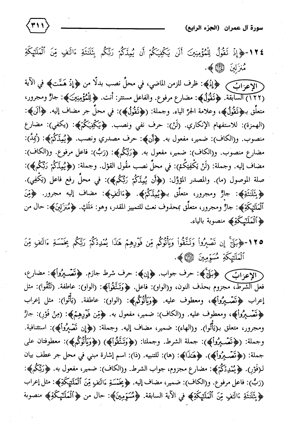 وجملة: {تَصْبِرُوا}: جملة الشرط. وجملتا: {وَتَتَّقُوا} {وَيَأْتُوكُمْ}: معطوفتان على جملة: {تَصْبِرُوا}. {هذا}: (ها): للتنبيه. (ذا): اسم إشارة مبني في محل جر عطف بيان ل (فور). {يُمْدِدْكُمْ}: مضارع مجزوم، جواب الشرط. و (الكاف): ضمير، مفعول به. {رَبُّكُمْ}: