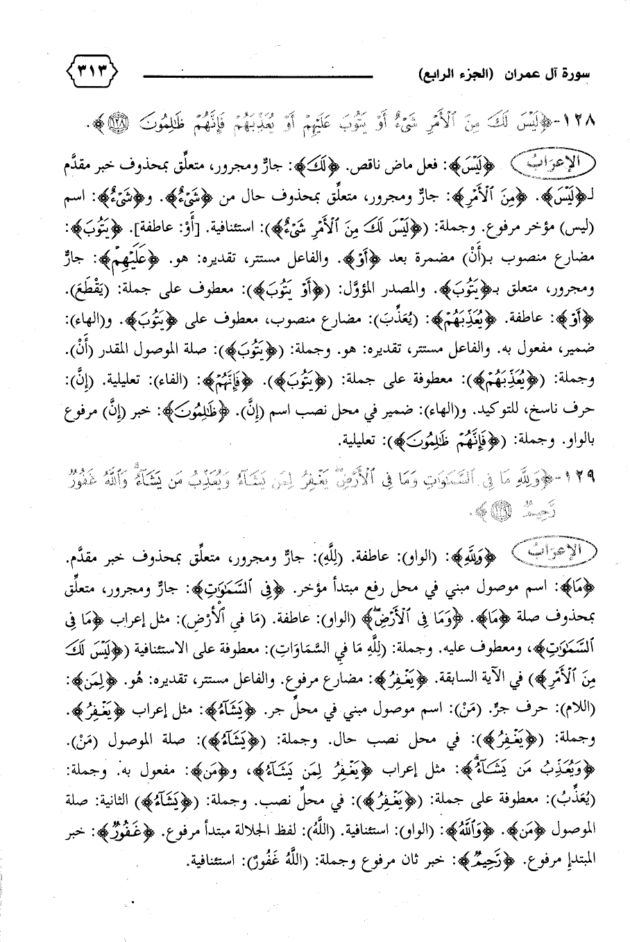 {ما}: اسم موصول مبني في محل رفع مبتدأ مؤخر. {فِي السَّماواتِ}: جارّ ومجرور، متعلّق بمحذوف صلة {ما}. {وَما فِي الْأَرْضِ} (الواو): عاطفة. (ما فى الأرض): مثل إعراب {ما فِي السَّماواتِ،} ومعطوف عليه. وجملة: (لله ما في السّماوات): معطوفة على الاستئنافية {لَيْسَ لَكَ مِنَ الْأَمْرِ} في الآية السابقة. {يَغْفِرُ}: مضارع مرفوع. والفاعل مستتر، تقديره: هو. {لِمَنْ}: