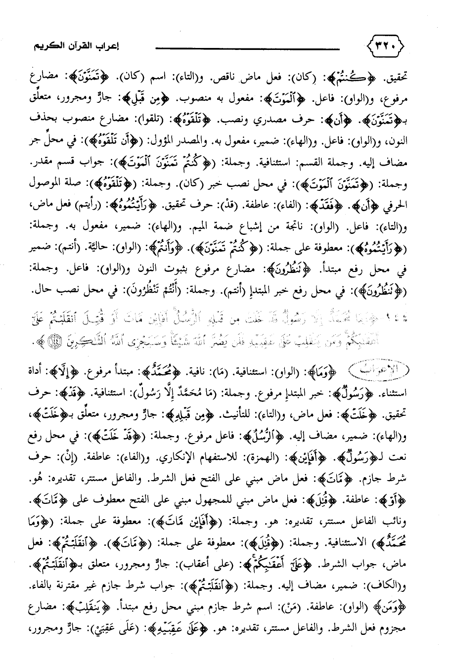 {وَما}: (الواو): استئنافية. (ما): نافية. {مُحَمَّدٌ}: مبتدأ مرفوع. {إِلاّ}: أداة استثناء. {رَسُولٌ}: خبر المبتدإ مرفوع. وجملة: (ما محمّد إلاّ رسول): استئنافية. {قَدْ}: حرف تحقيق. {خَلَتْ}: فعل ماض، و (التاء): للتأنيث. {مِنْ قَبْلِهِ}: جارّ ومجرور، متعلّق ب {خَلَتْ،} و (الهاء): ضمير، مضاف إليه. {الرُّسُلُ}: فاعل مرفوع. وجملة: {قَدْ خَلَتْ}: في محل رفع نعت ل {رَسُولٌ}. {أَفَإِنْ}: (الهمزة): للاستفهام الإنكاري. و (الفاء): عاطفة. (إن): حرف شرط جازم. {ماتَ}: فعل ماض مبني على الفتح فعل الشرط. والفاعل مستتر، تقديره: هو.