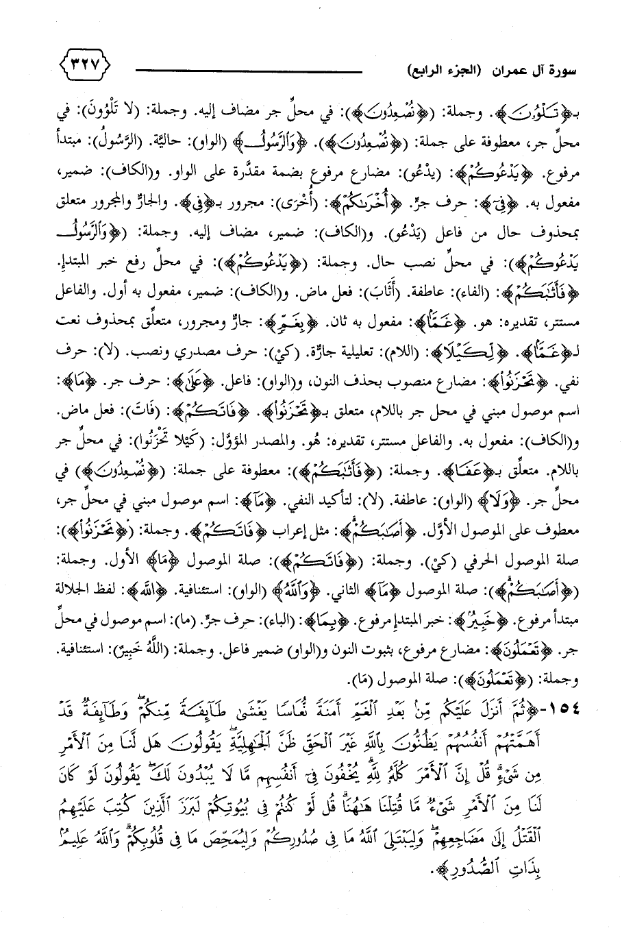 ب {تَلْوُونَ}. وجملة: {تُصْعِدُونَ}: في محلّ جر مضاف إليه. وجملة: (لا تلوون): في محلّ جر، معطوفة على جملة: {تُصْعِدُونَ}. {وَالرَّسُولُ} (الواو): حاليّة. (الرّسول): مبتدأ مرفوع. {يَدْعُوكُمْ}: (يدعو): مضارع مرفوع بضمة مقدّرة على الواو. و (الكاف): ضمير، مفعول به. {فِي}: حرف جرّ. {أُخْراكُمْ}: (أخرى): مجرور ب {فِي}. والجارّ والمجرور متعلق بمحذوف حال من فاعل (يدعو).و (الكاف): ضمير، مضاف إليه. وجملة: {وَالرَّسُولُ يَدْعُوكُمْ}: في محلّ نصب حال. وجملة: {يَدْعُوكُمْ}: في محلّ رفع خبر المبتدإ.