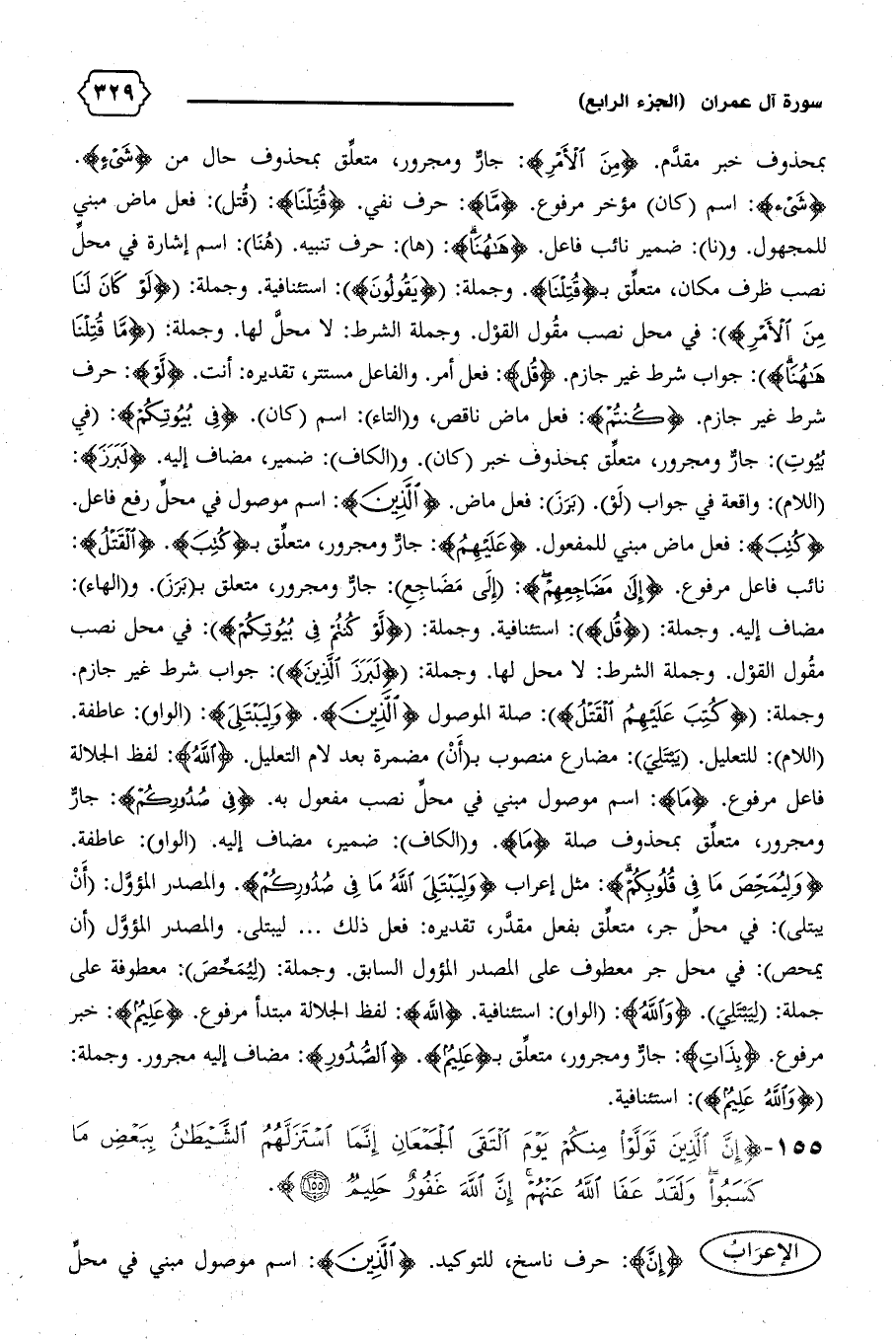{شَيْءٍ}: اسم (كان) مؤخر مرفوع. {ما}: حرف نفي. {قُتِلْنا}: (قتل): فعل ماض مبني للمجهول. و (نا): ضمير نائب فاعل. {هاهُنا}: (ها): حرف تنبيه. (هنا): اسم إشارة في محلّ نصب ظرف مكان، متعلّق ب {قُتِلْنا}. وجملة: {يَقُولُونَ}: استئنافية. وجملة: {لَوْ كانَ لَنا مِنَ الْأَمْرِ}: في محل نصب مقول القول. وجملة الشرط: لا محلّ لها. وجملة: {ما قُتِلْنا هاهُنا}: جواب شرط غير جازم. {قُلْ}: فعل أمر. والفاعل مستتر، تقديره: أنت. {لَوْ}: حرف شرط غير جازم. {كُنْتُمْ}: فعل ماض ناقص، و (التاء): اسم (كان). {فِي بُيُوتِكُمْ}: (في بيوت): جارّ ومجرور، متعلّق بمحذوف خبر (كان).و (الكاف): ضمير، مضاف إليه. {لَبَرَزَ}: