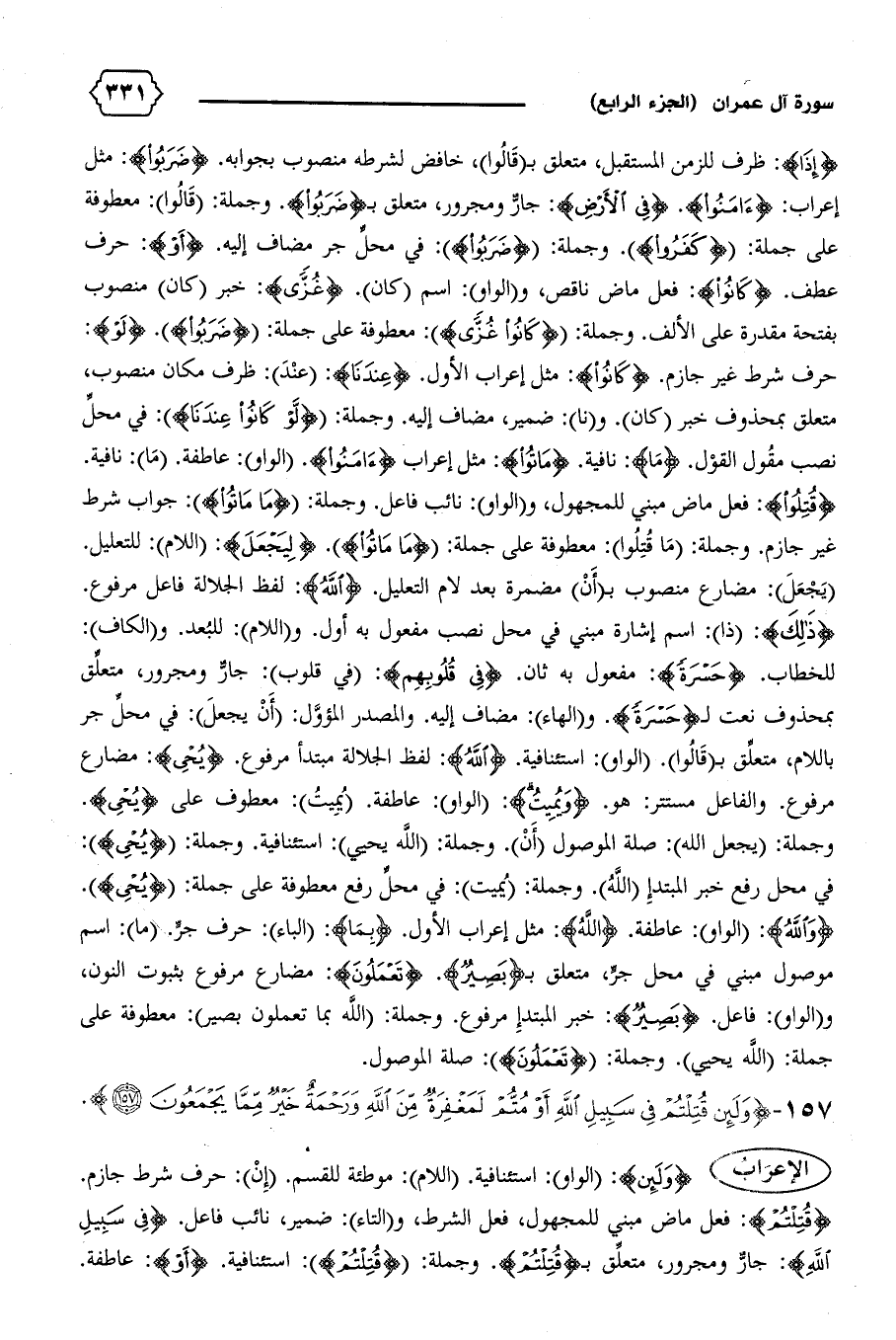 {قُتِلُوا}: فعل ماض مبني للمجهول، و (الواو): نائب فاعل. وجملة: {ما ماتُوا}: جواب شرط غير جازم. وجملة: (ما قتلوا): معطوفة على جملة: {ما ماتُوا}. {لِيَجْعَلَ}: (اللام): للتعليل.