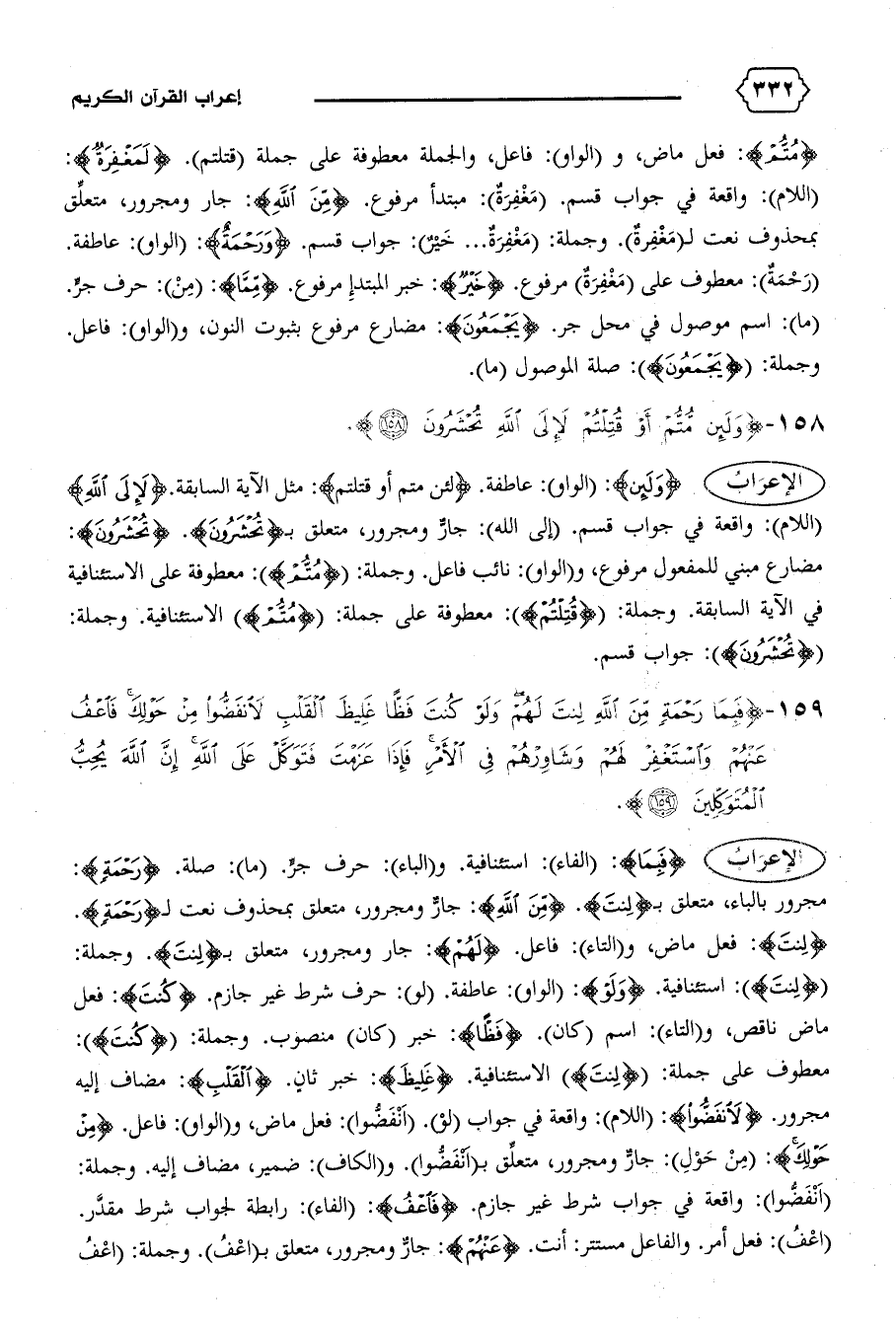 {وَلَئِنْ}: (الواو): عاطفة. {لَئِنْ مُتُّمْ أَوْ قُتِلْتُمْ}: مثل الآية السابقة. {لَإِلَى اللهِ} (اللام): واقعة في جواب قسم. (إلى الله): جارّ ومجرور، متعلق ب {تُحْشَرُونَ}. {تُحْشَرُونَ}: