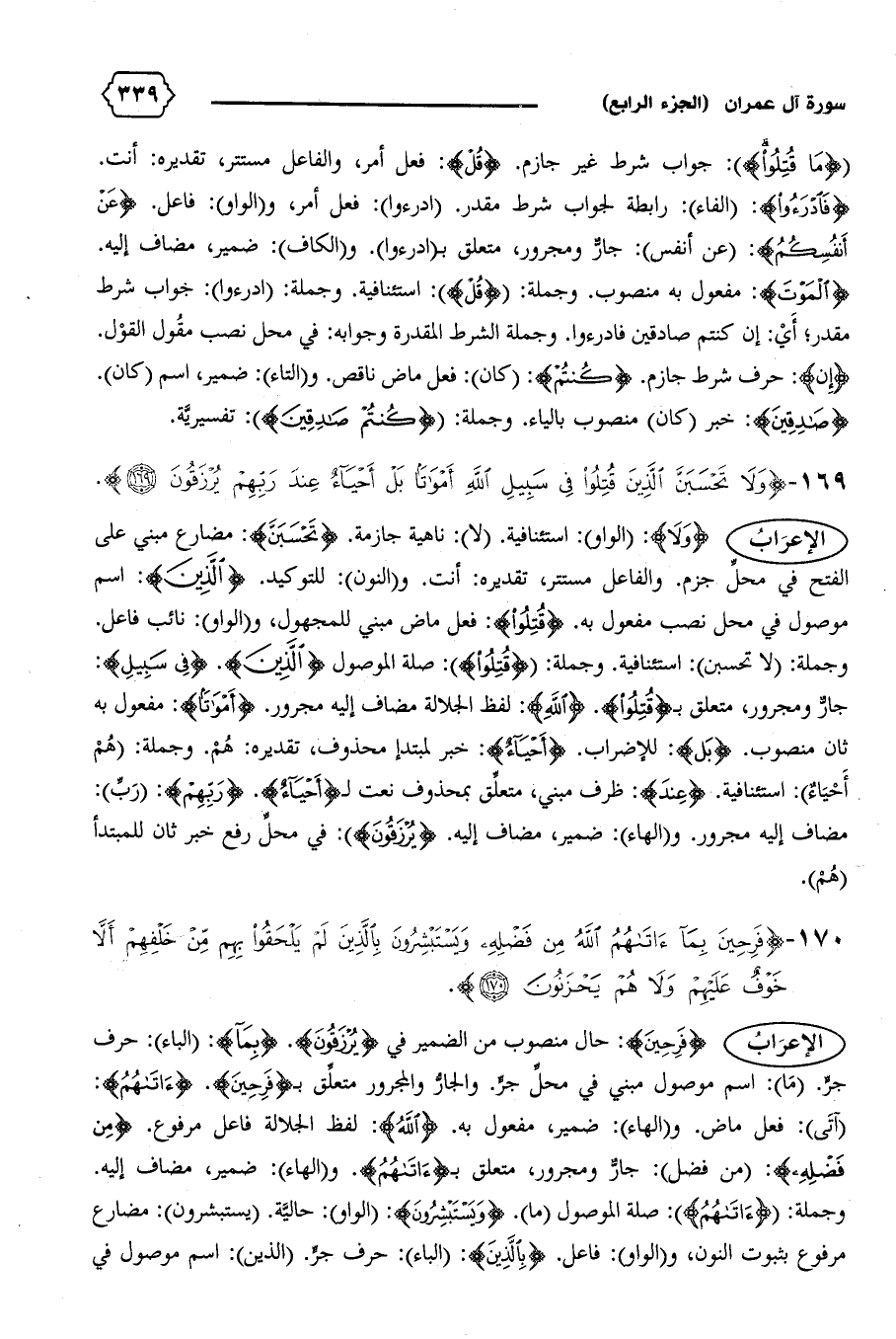 ١٦٩ - {وَلا تَحْسَبَنَّ الَّذِينَ قُتِلُوا فِي سَبِيلِ اللهِ أَمْواتاً بَلْ أَحْياءٌ عِنْدَ رَبِّهِمْ يُرْزَقُونَ (١٦٩)}