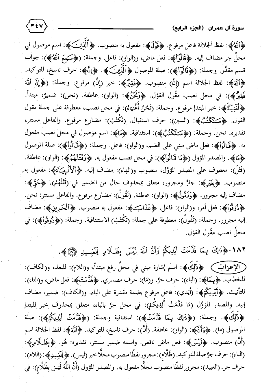 {أَغْنِياءُ}: خبر المبتدإ مرفوع. وجملة: (نحن أغنياء): في محل نصب، معطوفة على جملة مقول القول. {سَنَكْتُبُ}: (السين): حرف استقبال. (نكتب): مضارع مرفوع. والفاعل مستتر، تقديره: نحن. وجملة: {سَنَكْتُبُ}: استئنافية. {ما}: اسم موصول في محل نصب مفعول به. {قالُوا}: فعل ماض مبني على الضم، و (الواو): فاعل. وجملة: {قالُوا}: صلة الموصول {ما}. والمصدر المؤول {ما قالُوا}: في محل نصب مفعول به. {وَقَتْلَهُمُ}: (الواو): عاطفة.