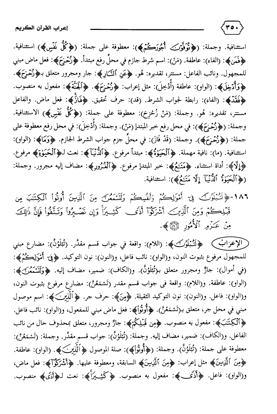 (الواو): عاطفة. و (اللام): واقعة فى جواب قسم مقدر (تسمعنّ): مضارع مرفوع بثبوت النون، و (الواو): فاعل. و (النون): نون التوكيد الثقيلة. {مِنَ}: حرف جر. {الَّذِينَ}: اسم موصول مبني في محل جر، متعلق ب (تسمعنّ). {أُوتُوا}: فعل ماض مبني للمفعول، و (الواو): نائب فاعل.