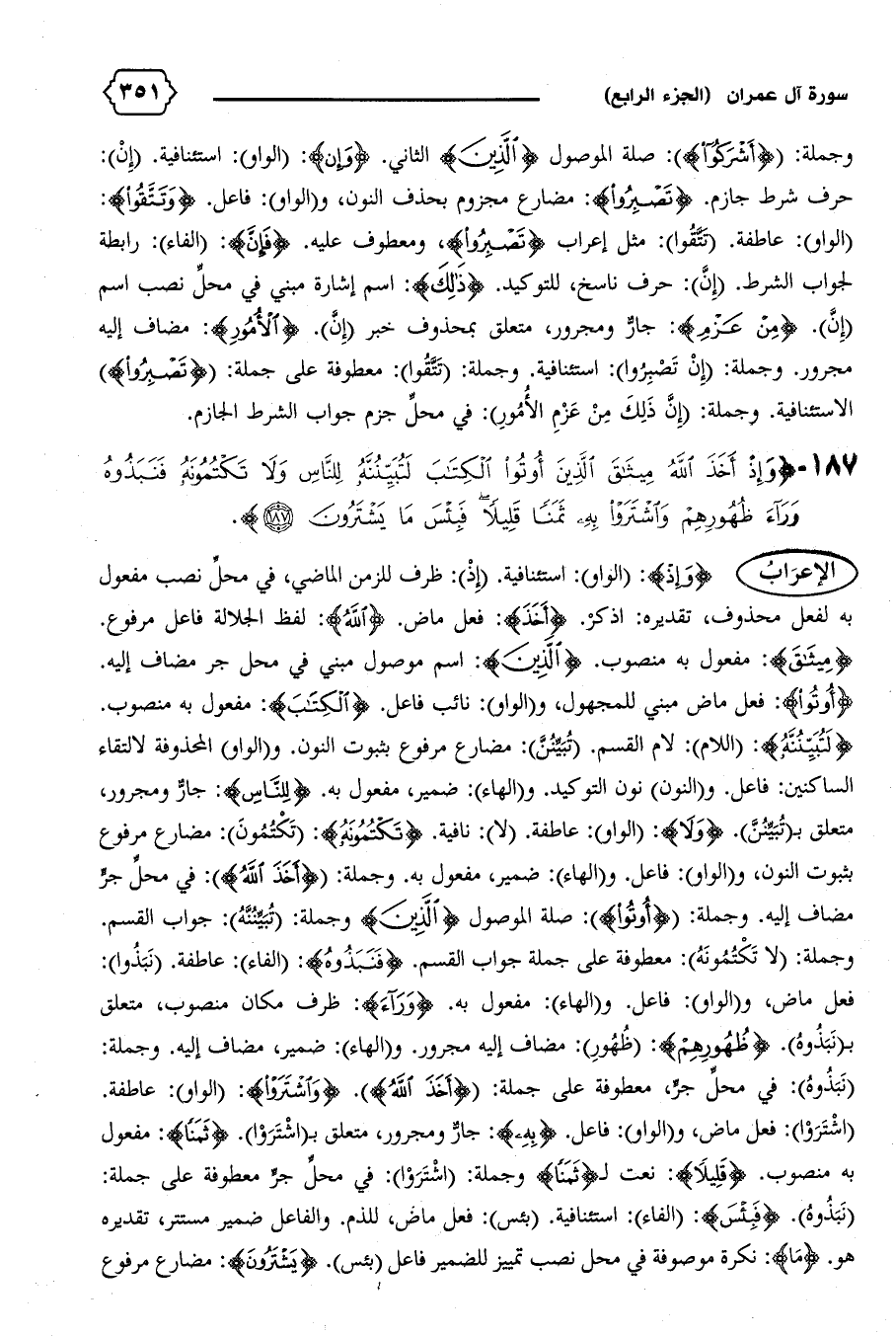 {لَتُبَيِّنُنَّهُ}: (اللام): لام القسم. (تبيّننّ): مضارع مرفوع بثبوت النون. و (الواو) المحذوفة لالتقاء الساكنين: فاعل. و (النون) نون التوكيد. و (الهاء): ضمير، مفعول به. {لِلنّاسِ}: جارّ ومجرور، متعلق ب (تبيّننّ). {وَلا}: (الواو): عاطفة. (لا): نافية. {تَكْتُمُونَهُ}: (تكتمون): مضارع مرفوع بثبوت النون، و (الواو): فاعل. و (الهاء): ضمير، مفعول به. وجملة: {أَخَذَ اللهُ}: في محلّ جرّ مضاف إليه. وجملة: {أُوتُوا}: صلة الموصول {الَّذِينَ} وجملة: (تبيّننّه): جواب القسم.