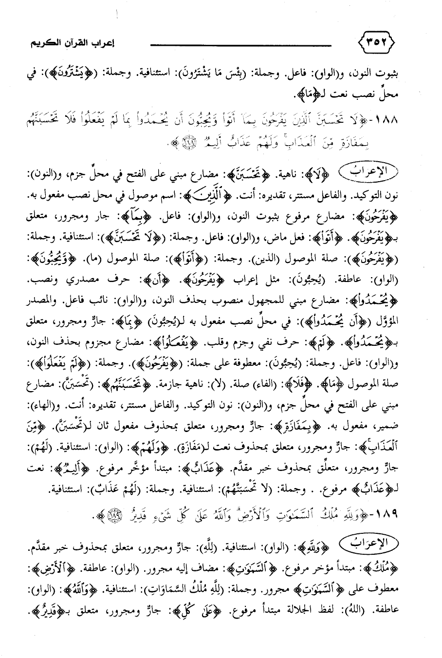 {يُحْمَدُوا}: مضارع مبني للمجهول منصوب بحذف النون، و (الواو): نائب فاعل. والمصدر المؤوّل {أَنْ يُحْمَدُوا}: في محلّ نصب مفعول به ل (يحبّون) {بِما}: جارّ ومجرور، متعلق ب {يُحْمَدُوا}. {لَمْ}: حرف نفي وجزم وقلب. {يَفْعَلُوا}: مضارع مجزوم بحذف النون، و (الواو): فاعل. وجملة: (يحبّون): معطوفة على جملة: {يَفْرَحُونَ}. وجملة: {لَمْ يَفْعَلُوا}: