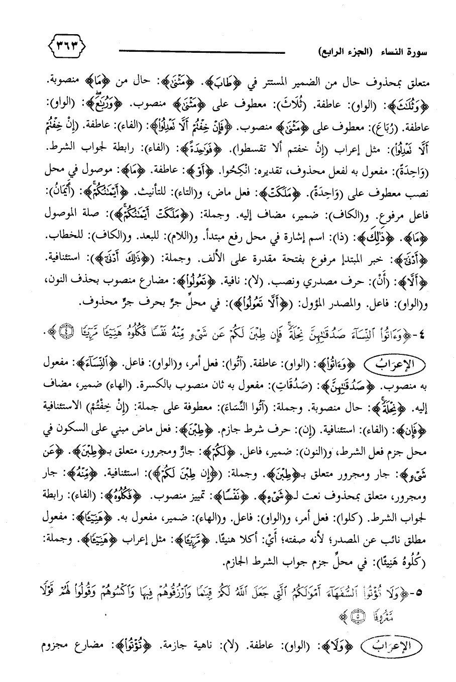 عاطفة. (رباع): معطوف على {مَثْنى} منصوب. {فَإِنْ خِفْتُمْ أَلاّ تَعْدِلُوا}: (الفاء): عاطفة. (إن خفتم ألاّ تعدلوا): مثل إعراب (إن خفتم ألا تقسطوا). {فَواحِدَةً}: (الفاء): رابطة لجواب الشرط.