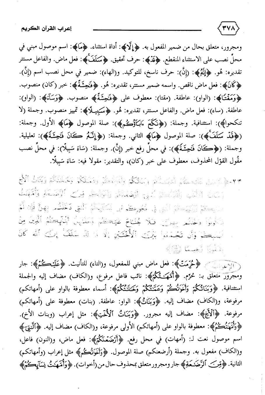 {حُرِّمَتْ}: فعل ماض مبني للمفعول، و (التاء) للتأنيث. {عَلَيْكُمْ}: جار ومجرور متعلق ب: حرّم. {أُمَّهاتُكُمْ}: نائب فاعل مرفوع، و (الكاف) مضاف إليه والجملة استئنافية. {وَبَناتُكُمْ وَأَخَواتُكُمْ وَعَمّاتُكُمْ وَخالاتُكُمْ}: أسماء معطوفة بالواو على (أمهاتكم) مرفوعة، و (الكاف) مضاف إليه. {وَبَناتُ}: الواو: عاطفة. (بنات) معطوفة على (أمهاتكم) مرفوعة. {الْأَخِ}: مضاف إليه مجرور. {وَبَناتُ الْأُخْتِ}: مثل إعراب (وبنات الأخ).