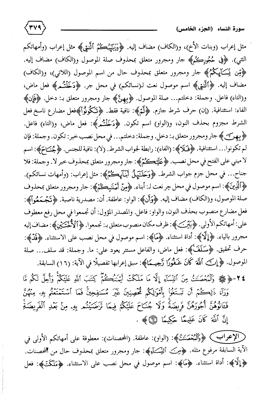 {وَالْمُحْصَناتُ}: (الواو): عاطفة. (المحصنات): معطوفة على أمهاتكم الأولى في الآية السابقة مرفوع مثله. {مِنَ النِّساءِ}: جار ومجرور متعلق بمحذوف حال من المحصنات.