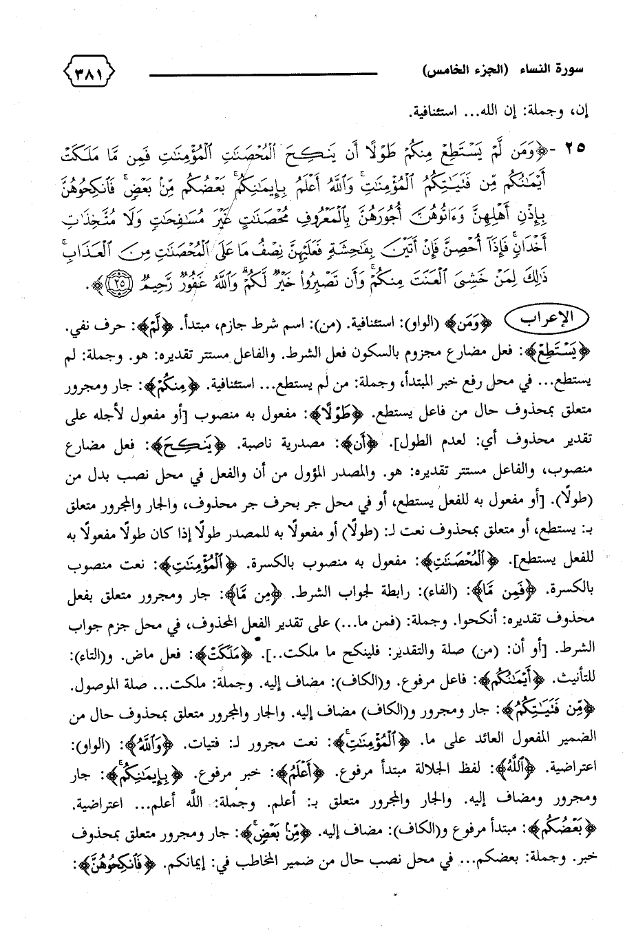 ٢٥ - {وَمَنْ لَمْ يَسْتَطِعْ مِنْكُمْ طَوْلاً أَنْ يَنْكِحَ الْمُحْصَناتِ الْمُؤْمِناتِ فَمِنْ ما مَلَكَتْ أَيْمانُكُمْ مِنْ فَتَياتِكُمُ الْمُؤْمِناتِ وَاللهُ أَعْلَمُ بِإِيمانِكُمْ بَعْضُكُمْ مِنْ بَعْضٍ فَانْكِحُوهُنَّ بِإِذْنِ أَهْلِهِنَّ وَآتُوهُنَّ أُجُورَهُنَّ بِالْمَعْرُوفِ مُحْصَناتٍ غَيْرَ مُسافِحاتٍ وَلا مُتَّخِذاتِ أَخْدانٍ فَإِذا أُحْصِنَّ فَإِنْ أَتَيْنَ بِفاحِشَةٍ فَعَلَيْهِنَّ نِصْفُ ما عَلَى الْمُحْصَناتِ مِنَ الْعَذابِ ذلِكَ لِمَنْ خَشِيَ الْعَنَتَ مِنْكُمْ وَأَنْ تَصْبِرُوا خَيْرٌ لَكُمْ وَاللهُ غَفُورٌ رَحِيمٌ (٢٥)}