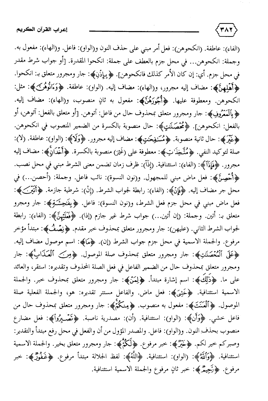 {بِالْمَعْرُوفِ}: جار ومجرور متعلق بمحذوف حال من فاعل: آتوهن. [أو متعلق بالفعل: آتوهن، أو بالفعل: انكحوهن]. {مُحْصَناتٍ}: حال منصوبة بالكسرة من الضمير المنصوب في انكحوهن.