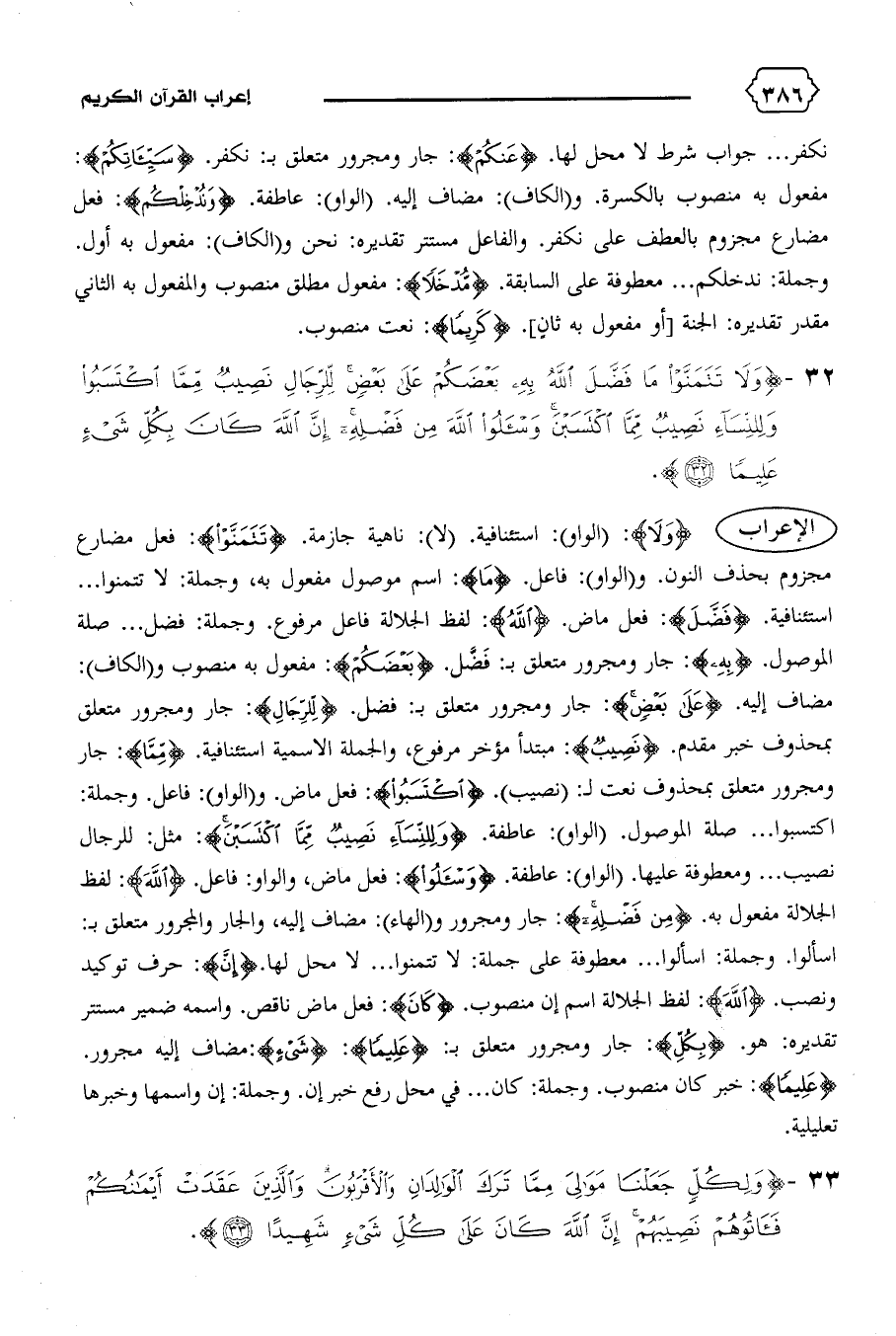 اكتسبوا ... صلة الموصول. (الواو): عاطفة. {وَلِلنِّساءِ نَصِيبٌ مِمَّا اكْتَسَبْنَ}: مثل: للرجال نصيب ... ومعطوفة عليها. (الواو): عاطفة. {وَسْئَلُوا}: فعل ماض، والواو: فاعل. {اللهُ}: لفظ الجلالة مفعول به. {مِنْ فَضْلِهِ}: جار ومجرور و (الهاء): مضاف إليه، والجار والمجرور متعلق ب: