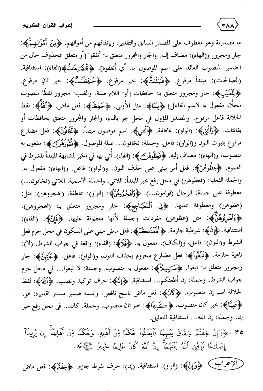 {لِلْغَيْبِ}: جار ومجرور متعلق ب: حافظات [أو: اللام صلة. والغيب: مجرور لفظا منصوب محلاّ، مفعول به لاسم الفاعل] {بِما}: مثل الأولى. {حَفِظَ}: فعل ماض. {اللهُ}: لفظ الجلالة فاعل مرفوع. والمصدر المؤول في محل جر بالباء، والجار والمجرور متعلق بحافظات أو بقانتات. {وَاللاّتِي}: (الواو): عاطفة. {اللاّتِي}: اسم موصول مبتدأ. {تَخافُونَ}: فعل مضارع مرفوع بثبوت النون و (الواو): فاعل. وجملة: تخافون ... صلة الموصول. {نُشُوزَهُنَّ}: مفعول به منصوب، و (الهاء): مضاف إليه. {فَعِظُوهُنَّ}: (الفاء): أتي بها في الخبر لمشابهة المبتدأ للشرط في العموم. (عظوهن): فعل أمر مبني على حذف النون. و (الواو): فاعل. و (الهاء): مفعول به.