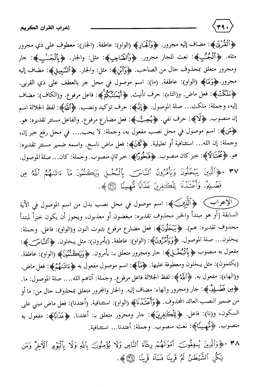 {الْقُرْبى}: مضاف إليه مجرور. {وَالْجارِ} (الواو): عاطفة. (الجار): معطوف على ذي مجرور مثله. {الْجُنُبِ}: نعت للجار مجرور. {وَالصّاحِبِ}: مثل: والجار. {بِالْجَنْبِ}: جار ومجرور متعلق بمحذوف حال من الصاحب. {وَابْنِ}: مثل: والجار. {السَّبِيلِ}: مضاف إليه مجرور. {وَما} (الواو): عاطفة. (ما): اسم موصول في محل جر بالعطف على ذي القربى.