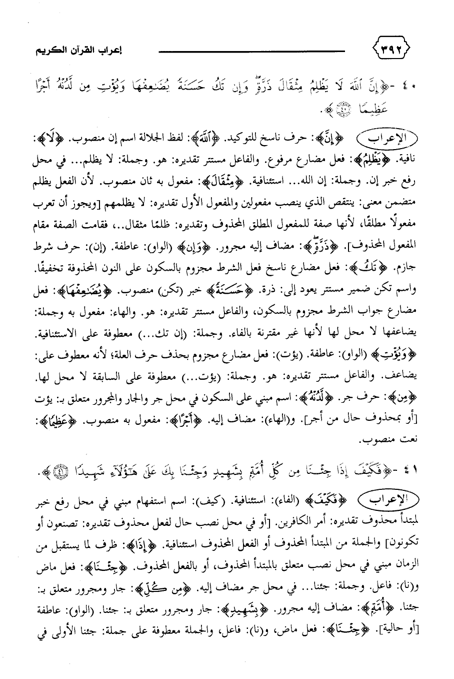 نافية. {يَظْلِمُ}: فعل مضارع مرفوع. والفاعل مستتر تقديره: هو. وجملة: لا يظلم ... في محل رفع خبر إن. وجملة: إن الله ... استئنافية. {مِثْقالَ}: مفعول به ثان منصوب. لأن الفعل يظلم متضمن معنى: ينتقص الذي ينصب مفعولين والمفعول الأول تقديره: لا يظلمهم [ويجوز أن تعرب مفعولا مطلقا، لأنها صفة للمفعول المطلق المحذوف وتقديره: ظلما مثقال .. ، فقامت الصفة مقام المفعول المحذوف]. {ذَرَّةٍ}: مضاف إليه مجرور. {وَإِنْ} (الواو): عاطفة. (إن): حرف شرط جازم. {تَكُ}: فعل مضارع ناسخ فعل الشرط مجزوم بالسكون على النون المحذوفة تخفيفا.