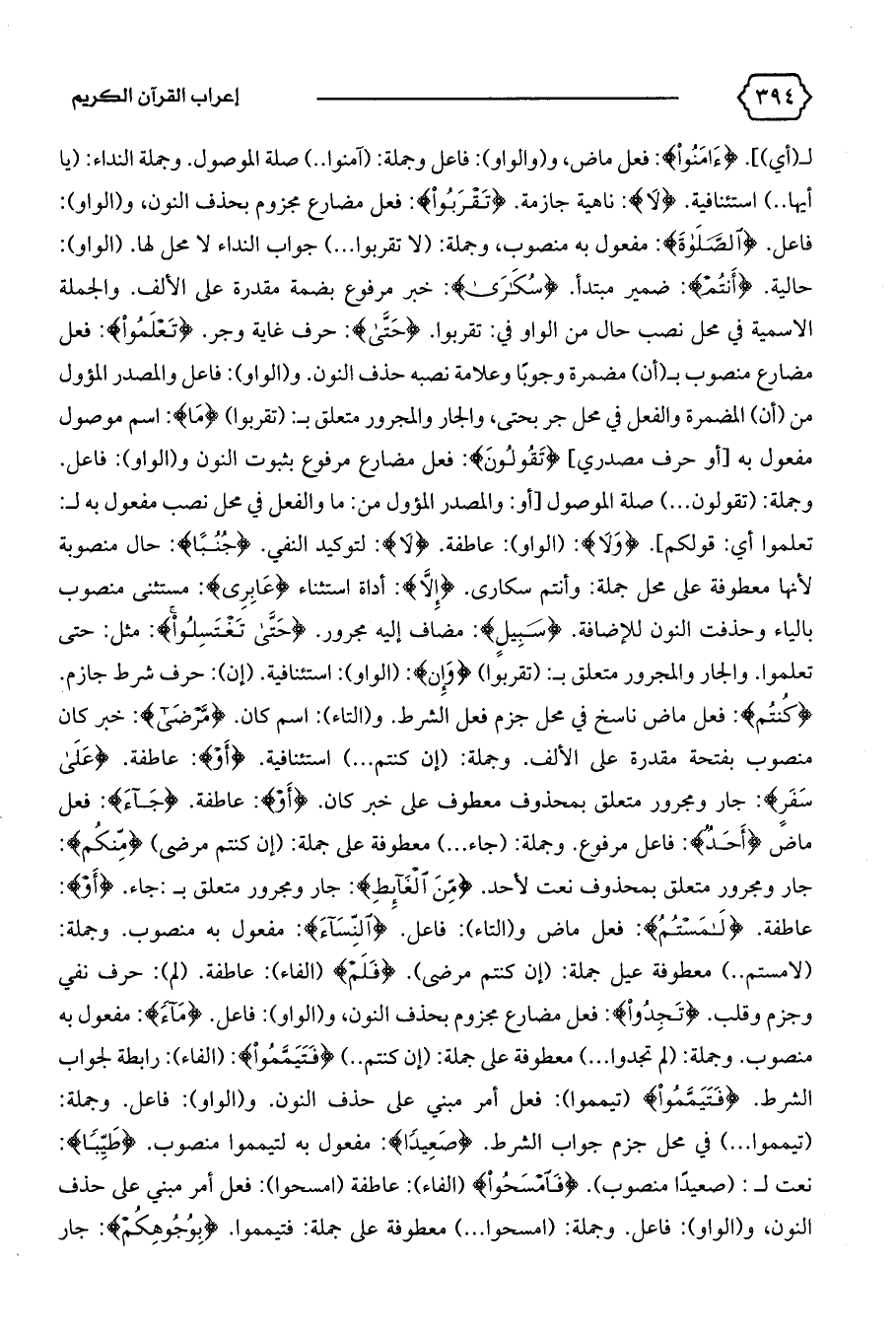تعلموا أي: قولكم]. {وَلا}: (الواو): عاطفة. {لا}: لتوكيد النفي. {جُنُباً}: حال منصوبة لأنها معطوفة على محل جملة: وأنتم سكارى. {إِلاّ}: أداة استثناء {عابِرِي}: مستثنى منصوب بالياء وحذفت النون للإضافة. {سَبِيلٍ}: مضاف إليه مجرور. {حَتَّى تَغْتَسِلُوا}: مثل: حتى تعلموا. والجار والمجرور متعلق ب: (تقربوا) {وَإِنْ}: (الواو): استئنافية. (إن): حرف شرط جازم.