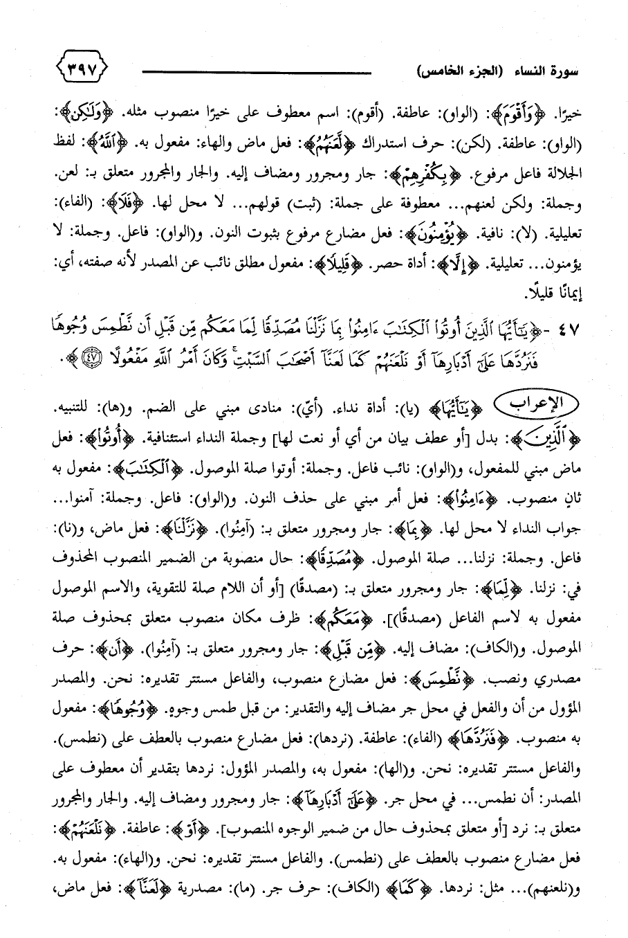 فاعل. وجملة: نزلنا ... صلة الموصول. {مُصَدِّقاً}: حال منصوبة من الضمير المنصوب المحذوف في: نزلنا. {لِما}: جار ومجرور متعلق ب: (مصدقا) [أو أن اللام صلة للتقوية، والاسم الموصول مفعول به لاسم الفاعل (مصدقا)]. {مَعَكُمْ}: ظرف مكان منصوب متعلق بمحذوف صلة الموصول. و (الكاف): مضاف إليه. {مِنْ قَبْلِ}: جار ومجرور متعلق ب: (آمنوا). {أَنْ}: حرف مصدري ونصب. {نَطْمِسَ}: فعل مضارع منصوب، والفاعل مستتر تقديره: نحن. والمصدر المؤول من أن والفعل في محل جر مضاف إليه والتقدير: من قبل طمس وجوه. {وُجُوهاً}: مفعول به منصوب. {فَنَرُدَّها} (الفاء): عاطفة. (نردها): فعل مضارع منصوب بالعطف على (نطمس).