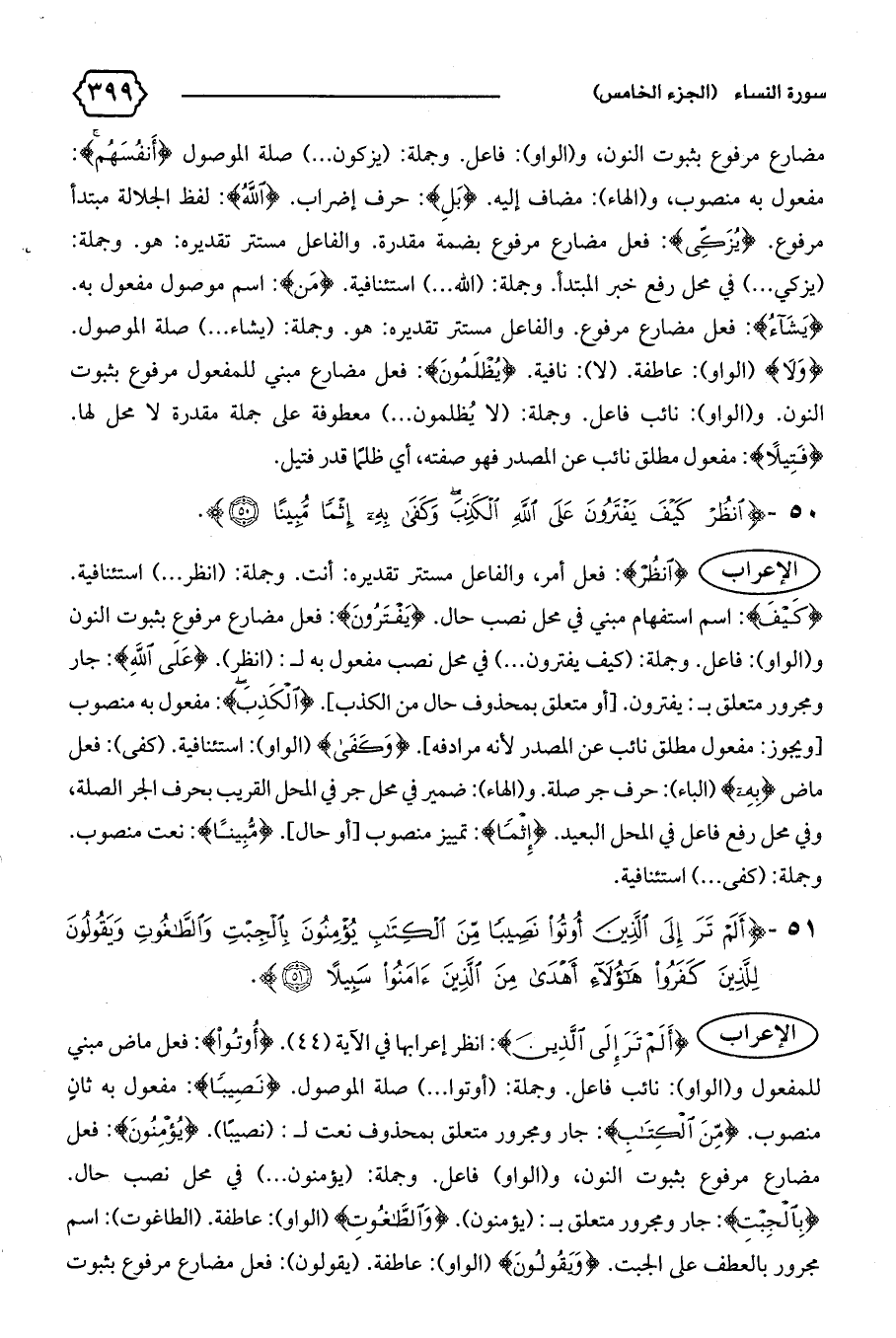 {أَلَمْ تَرَ إِلَى الَّذِينَ}: انظر إعرابها في الآية (٤٤). {أُوتُوا}: فعل ماض مبني للمفعول و (الواو): نائب فاعل. وجملة: (أوتوا ... ) صلة الموصول. {نَصِيباً}: مفعول به ثان منصوب. {مِنَ الْكِتابِ}: جار ومجرور متعلق بمحذوف نعت ل: (نصيبا). {يُؤْمِنُونَ}: فعل مضارع مرفوع بثبوت النون، و (الواو) فاعل. وجملة: (يؤمنون ... ) في محل نصب حال.