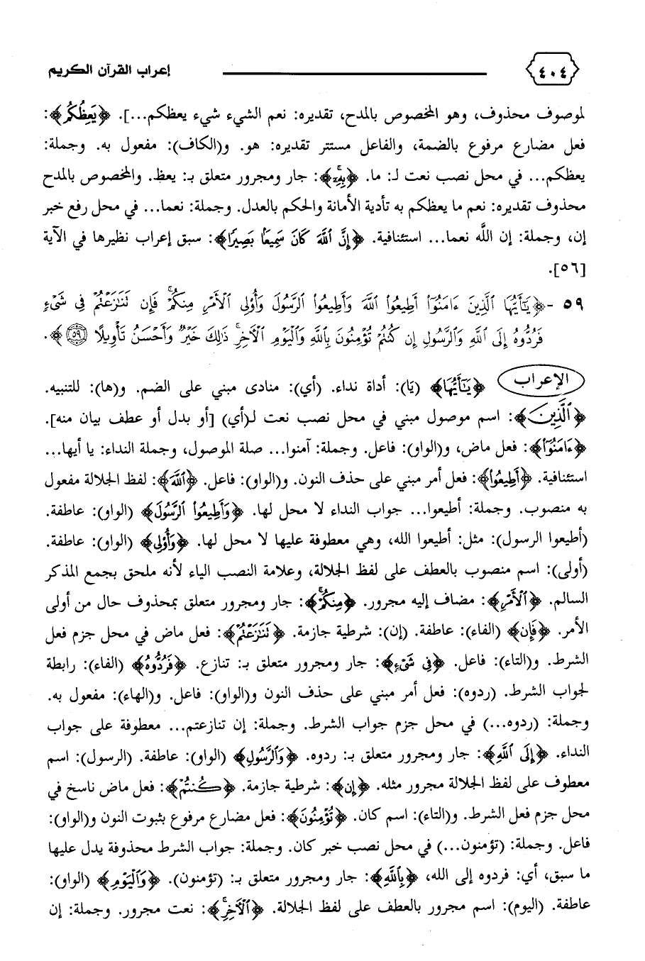 (أولى): اسم منصوب بالعطف على لفظ الجلالة، وعلامة النصب الياء لأنه ملحق بجمع المذكر السالم. {الْأَمْرِ}: مضاف إليه مجرور. {مِنْكُمْ}: جار ومجرور متعلق بمحذوف حال من أولى الأمر. {فَإِنْ} (الفاء): عاطفة. (إن): شرطية جازمة. {تَنازَعْتُمْ}: فعل ماض في محل جزم فعل الشرط. و (التاء): فاعل. {فِي شَيْءٍ}: جار ومجرور متعلق ب: تنازع. {فَرُدُّوهُ} (الفاء): رابطة لجواب الشرط. (ردوه): فعل أمر مبني على حذف النون و (الواو): فاعل. و (الهاء): مفعول به.