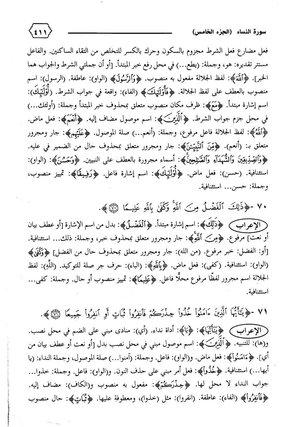 [أو: الفضل: خبر مرفوع. (من الله): جار ومجرور متعلق بمحذوف حال من الفضل] {وَكَفى} (الواو): استئنافية. (كفى): فعل ماض. {بِاللهِ}: (الباء): حرف جر صلة للتوكيد. (الله): لفظ الجلالة اسم مجرور لفظا مرفوع محلاّ فاعل. {عَلِيماً}: تمييز منصوب أو حال. وجملة: كفى