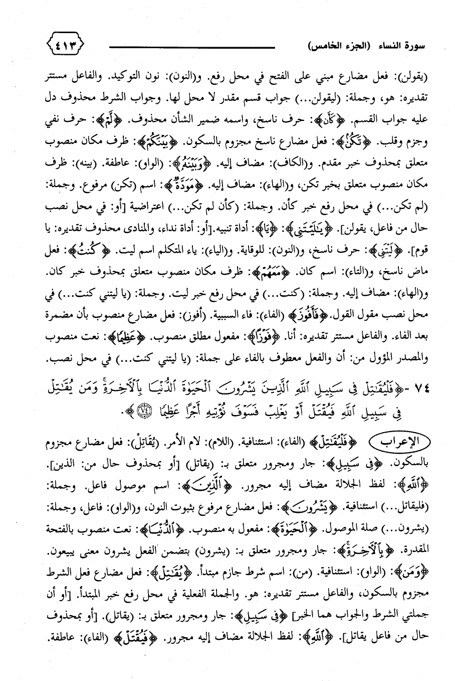 {فَلْيُقاتِلْ} (الفاء): استئنافية. (اللام): لام الأمر. (يقاتل): فعل مضارع مجزوم بالسكون. {فِي سَبِيلِ}: جار ومجرور متعلق ب: (يقاتل) [أو بمحذوف حال من: الذين].