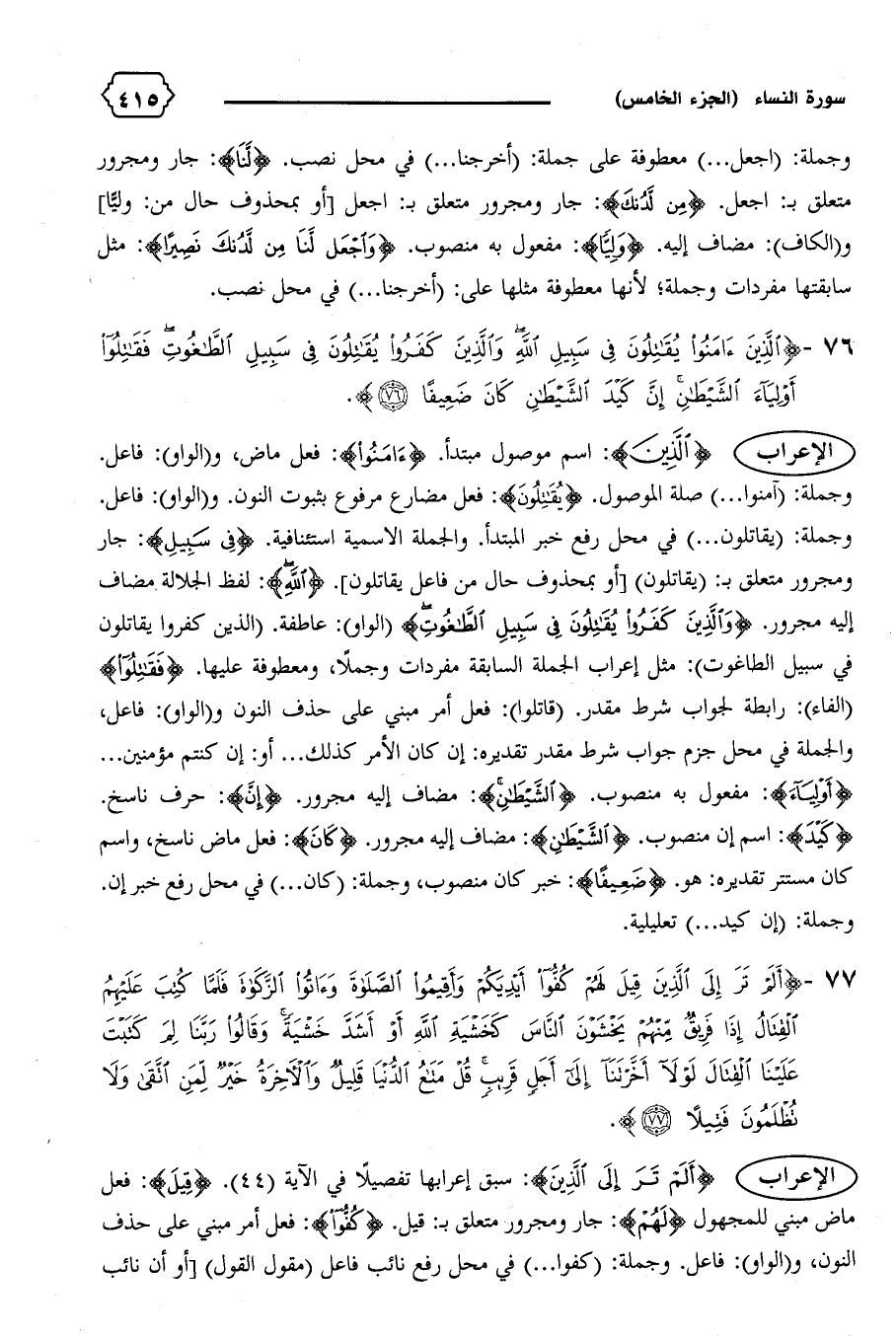 وجملة: (يقاتلون ... ) في محل رفع خبر المبتدأ. والجملة الاسمية استئنافية. {فِي سَبِيلِ}: جار ومجرور متعلق ب: (يقاتلون) [أو بمحذوف حال من فاعل يقاتلون]. {اللهِ}: لفظ الجلالة مضاف إليه مجرور. {وَالَّذِينَ كَفَرُوا يُقاتِلُونَ فِي سَبِيلِ الطّاغُوتِ} (الواو): عاطفة. (الذين كفروا يقاتلون في سبيل الطاغوت): مثل إعراب الجملة السابقة مفردات وجملا، ومعطوفة عليها. {فَقاتِلُوا} (الفاء): رابطة لجواب شرط مقدر. (قاتلوا): فعل أمر مبني على حذف النون و (الواو): فاعل، والجملة في محل جزم جواب شرط مقدر تقديره: إن كان الأمر كذلك ... أو: إن كنتم مؤمنين