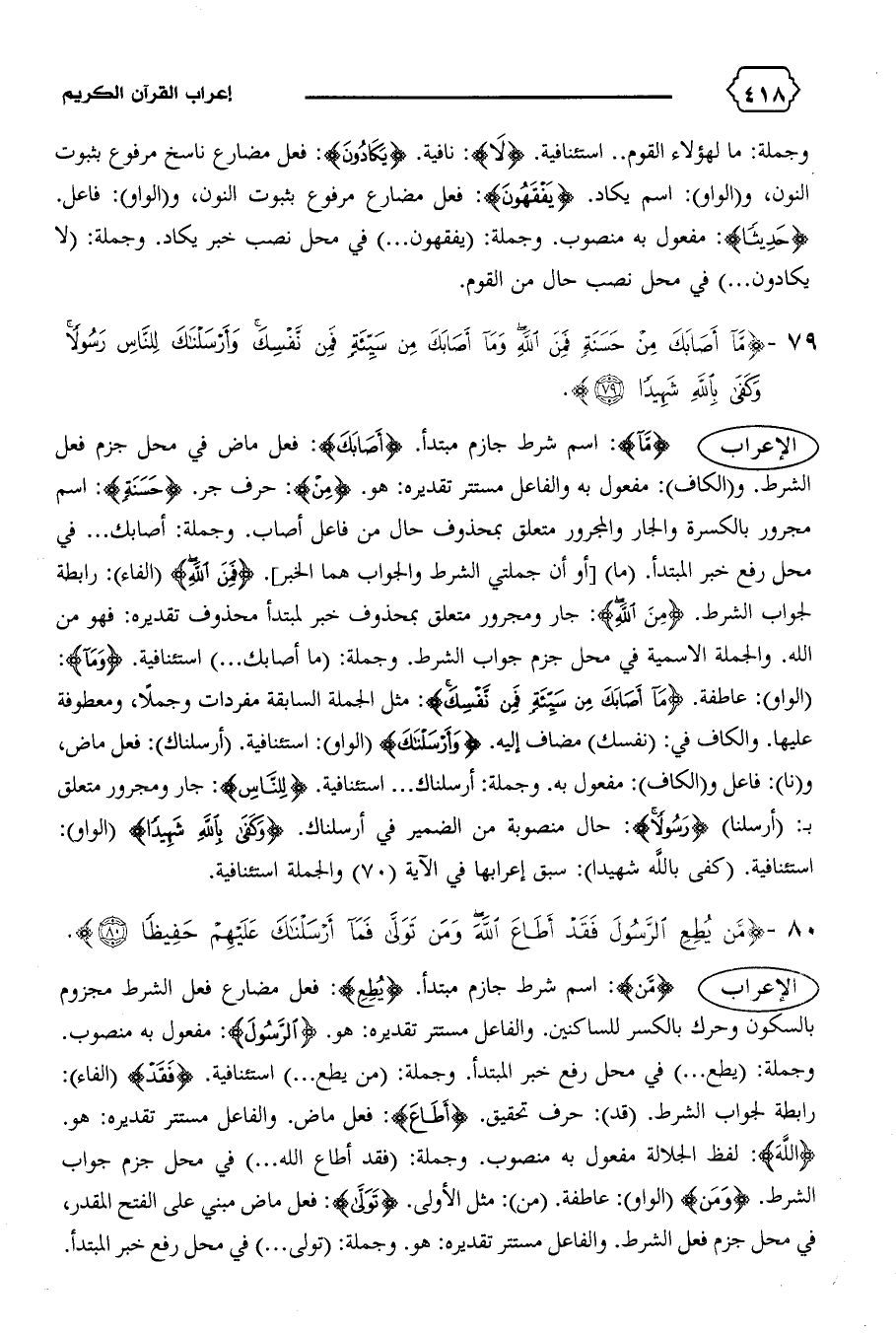 (الواو): عاطفة. {ما أَصابَكَ مِنْ سَيِّئَةٍ فَمِنْ نَفْسِكَ}: مثل الجملة السابقة مفردات وجملا، ومعطوفة عليها. والكاف في: (نفسك) مضاف إليه. {وَأَرْسَلْناكَ} (الواو): استئنافية. (أرسلناك): فعل ماض، و (نا): فاعل و (الكاف): مفعول به. وجملة: أرسلناك ... استئنافية. {لِلنّاسِ}: جار ومجرور متعلق ب: (أرسلنا) {رَسُولاً}: حال منصوبة من الضمير في أرسلناك. {وَكَفى بِاللهِ شَهِيداً} (الواو):