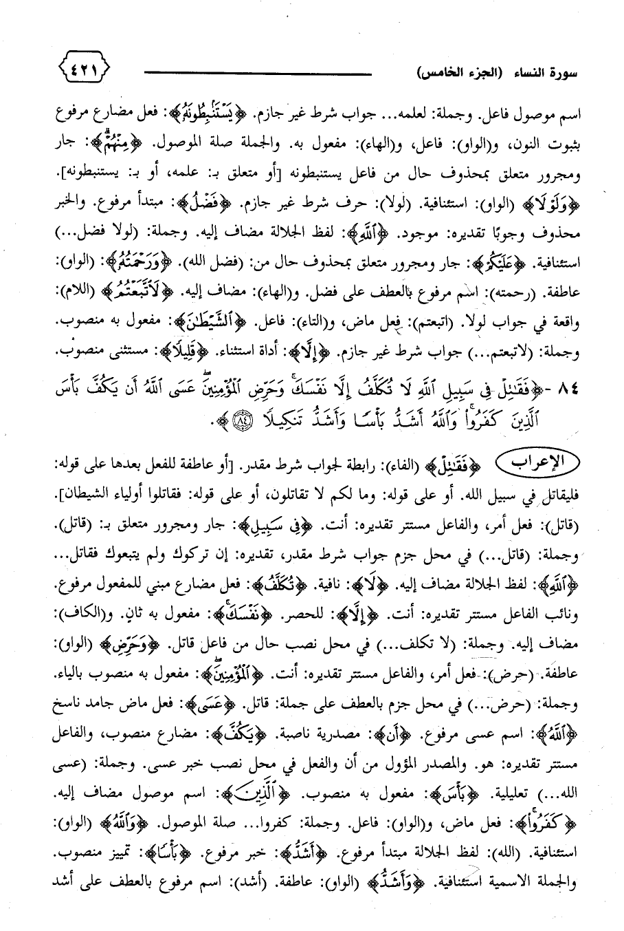 وجملة: (حرض ... ) في محل جزم بالعطف على جملة: قاتل. {عَسَى}: فعل ماض جامد ناسخ {اللهِ}: اسم عسى مرفوع. {أَنْ}: مصدرية ناصبة. {يَكُفَّ}: مضارع منصوب، والفاعل مستتر تقديره: هو. والمصدر المؤول من أن والفعل في محل نصب خبر عسى. وجملة: (عسى الله ... ) تعليلية. {بَأْسَ}: مفعول به منصوب. {الَّذِينَ}: اسم موصول مضاف إليه.