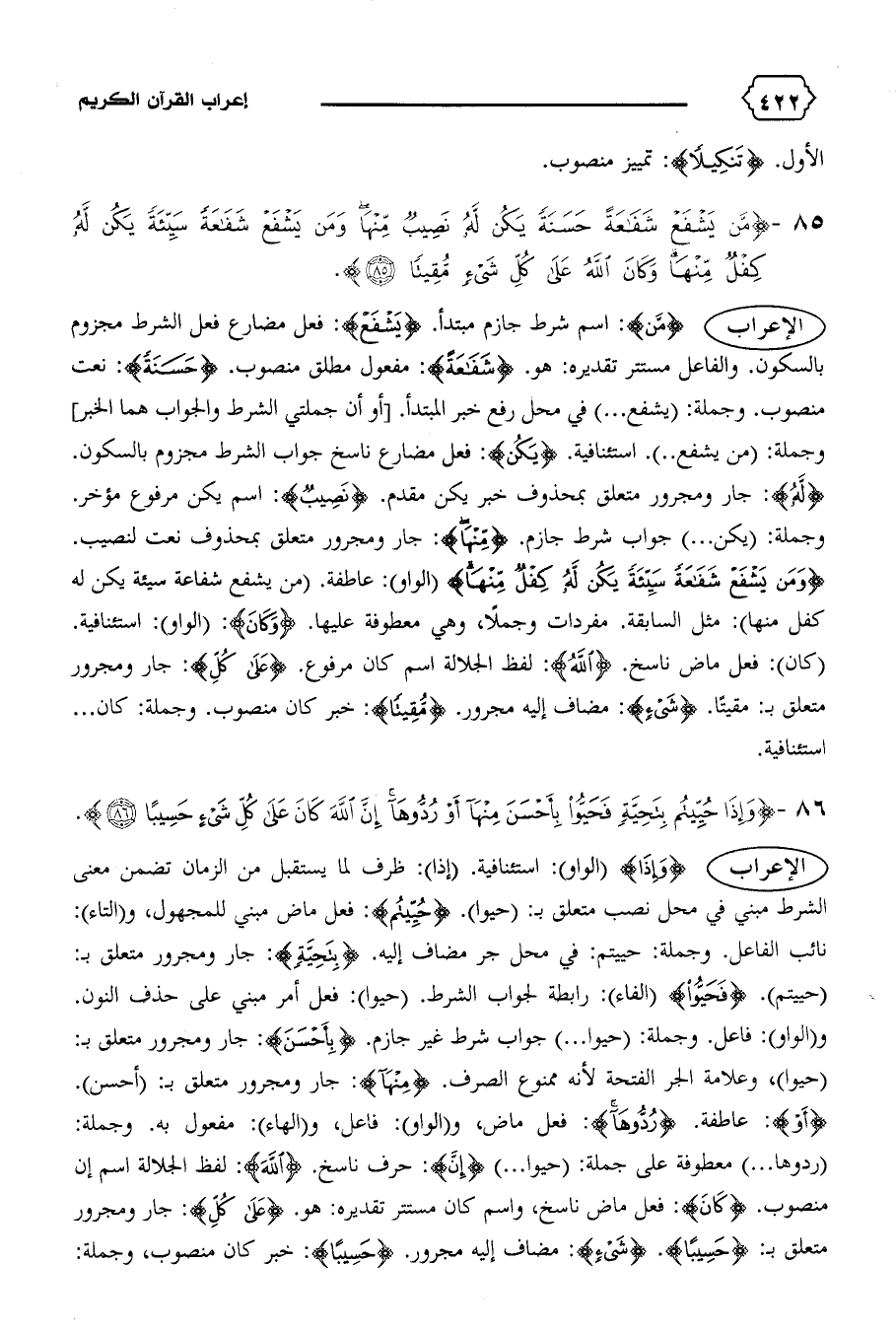 {وَمَنْ يَشْفَعْ شَفاعَةً سَيِّئَةً يَكُنْ لَهُ كِفْلٌ مِنْها} (الواو): عاطفة. (من يشفع شفاعة سيئة يكن له كفل منها): مثل السابقة. مفردات وجملا، وهي معطوفة عليها. {وَكانَ}: (الواو): استئنافية.