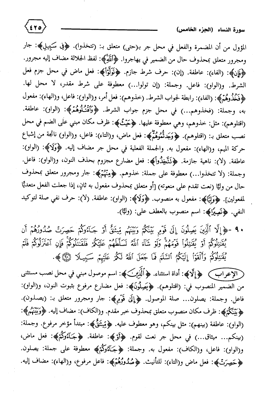 وجملة: (لا تتخذوا ... ) معطوفة على جملة: خذوهم. {مِنْهُمْ}: جار ومجرور متعلق بمحذوف حال من وليّا (نعت تقدم على منعوته) [أو متعلق بمحذوف مفعول به ثان، إذا جعلت الفعل متعدّيا لمفعولين]. {وَلِيًّا}: مفعول به منصوب. {وَلا}: (الواو): عاطفة. (لا): حرف نفي صلة لتوكيد النفي. {نَصِيراً}: اسم منصوب بالعطف على: (وليّا).