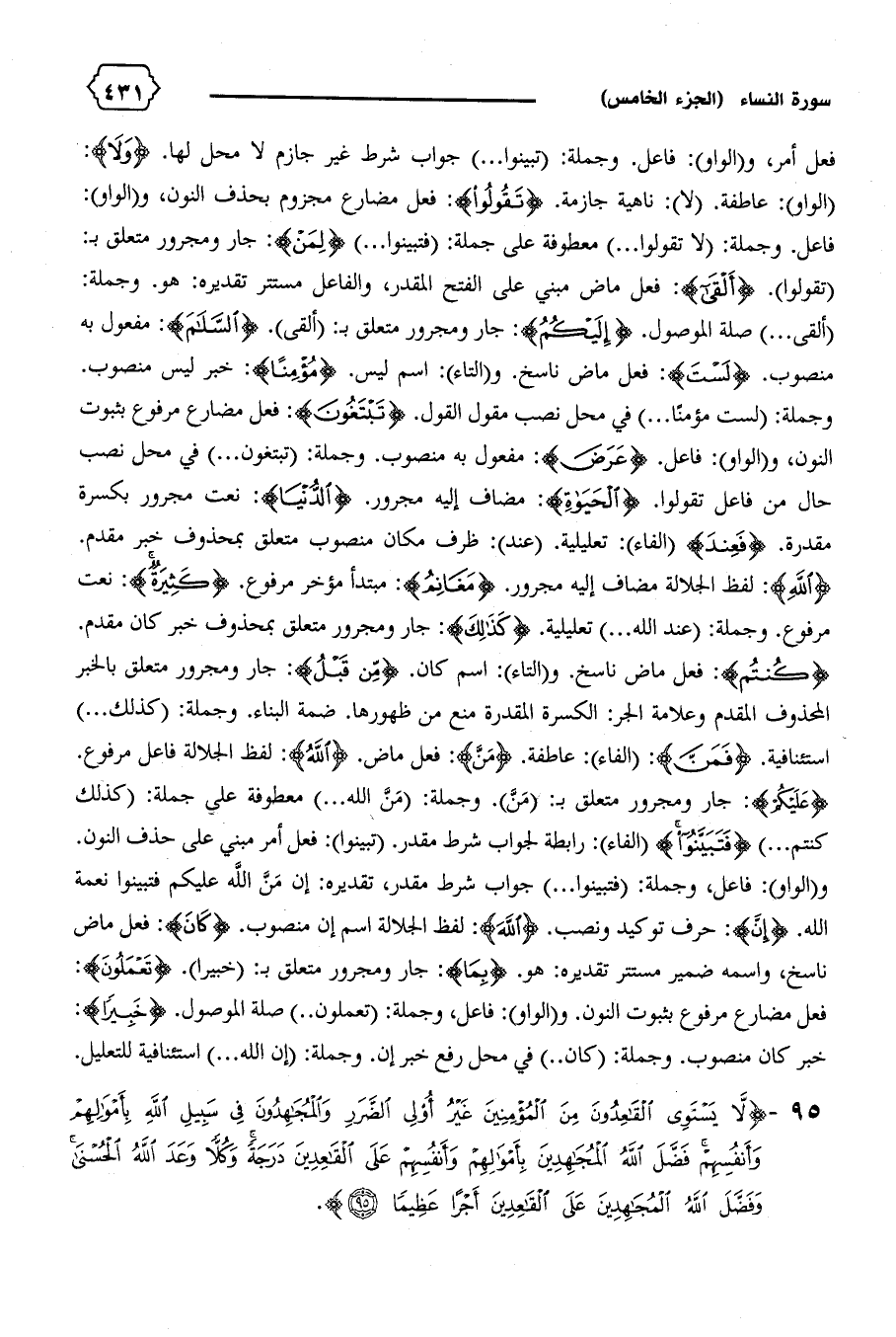 ٩٥ - {لا يَسْتَوِي الْقاعِدُونَ مِنَ الْمُؤْمِنِينَ غَيْرُ أُولِي الضَّرَرِ وَالْمُجاهِدُونَ فِي سَبِيلِ اللهِ بِأَمْوالِهِمْ وَأَنْفُسِهِمْ فَضَّلَ اللهُ الْمُجاهِدِينَ بِأَمْوالِهِمْ وَأَنْفُسِهِمْ عَلَى الْقاعِدِينَ دَرَجَةً وَكُلاًّ وَعَدَ اللهُ الْحُسْنى وَفَضَّلَ اللهُ الْمُجاهِدِينَ عَلَى الْقاعِدِينَ أَجْراً عَظِيماً (٩٥)}