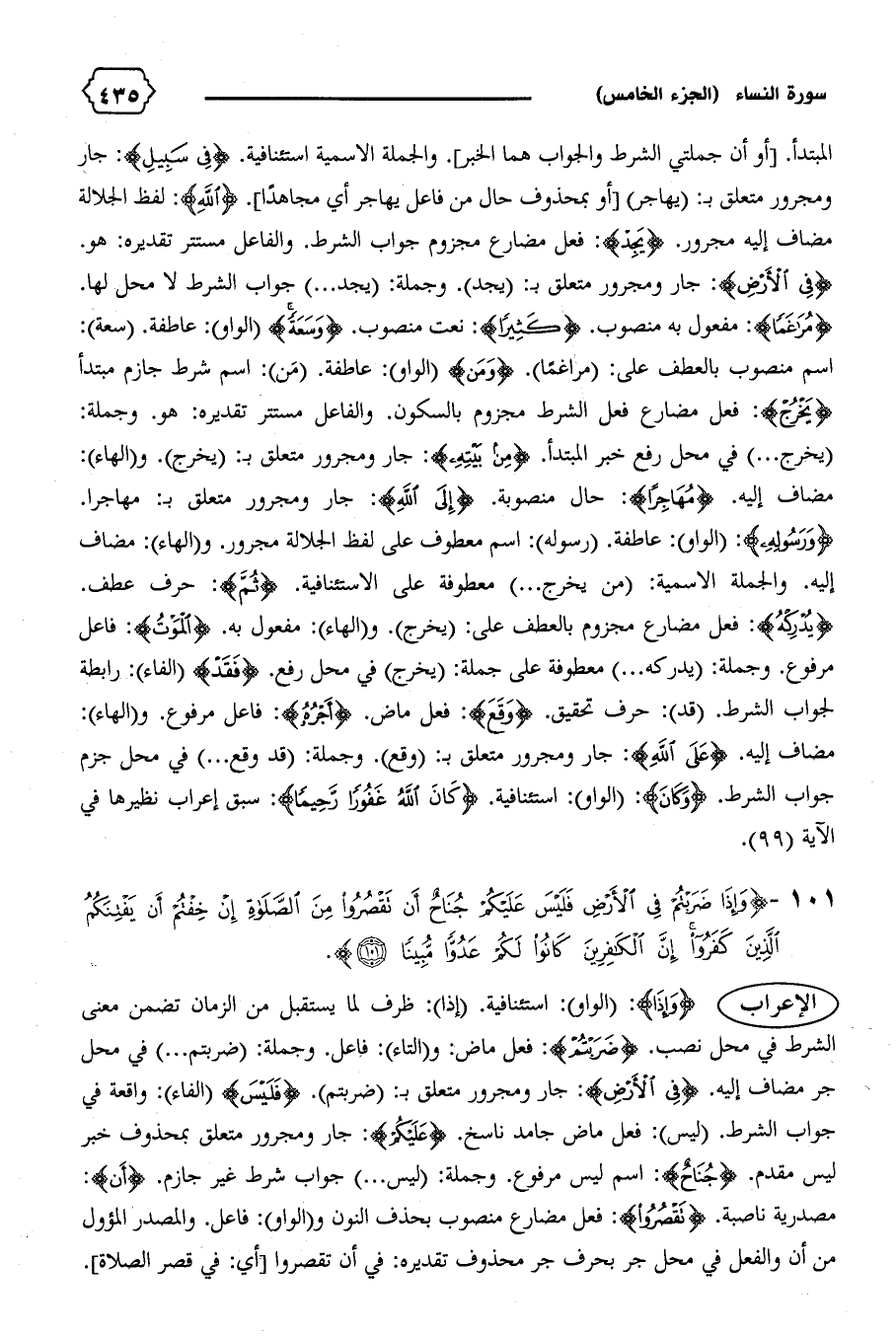 {وَإِذا}: (الواو): استئنافية. (إذا): ظرف لما يستقبل من الزمان تضمن معنى الشرط في محل نصب. {ضَرَبْتُمْ}: فعل ماض: و (التاء): فاعل. وجملة: (ضربتم ... ) في محل جر مضاف إليه. {فِي الْأَرْضِ}: جار ومجرور متعلق ب: (ضربتم). {فَلَيْسَ} (الفاء): واقعة في جواب الشرط. (ليس): فعل ماض جامد ناسخ. {عَلَيْكُمْ}: جار ومجرور متعلق بمحذوف خبر ليس مقدم. {جُناحٌ}: اسم ليس مرفوع. وجملة: (ليس ... ) جواب شرط غير جازم. {أَنْ}: