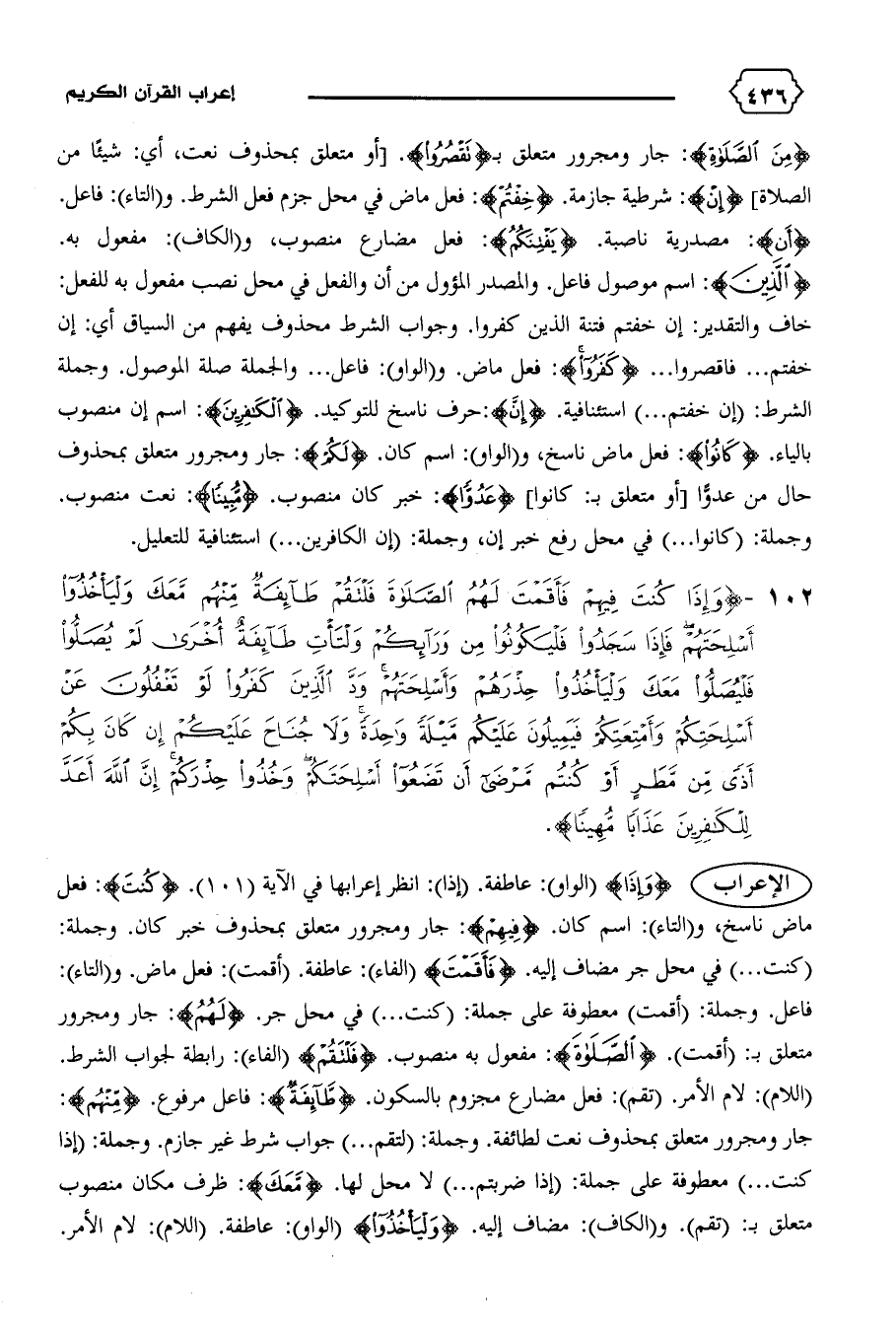 خاف والتقدير: إن خفتم فتنة الذين كفروا. وجواب الشرط محذوف يفهم من السياق أي: إن خفتم ... فاقصروا ... {كَفَرُوا}: فعل ماض. و (الواو): فاعل ... والجملة صلة الموصول. وجملة الشرط: (إن خفتم ... ) استئنافية. {أَنْ}: حرف ناسخ للتوكيد. {الْكافِرِينَ}: اسم إن منصوب بالياء. {كانُوا}: فعل ماض ناسخ، و (الواو): اسم كان. {لَكُمْ}: جار ومجرور متعلق بمحذوف حال من عدوّا [أو متعلق ب: كانوا] {عَدُوًّا}: خبر كان منصوب. {مُبِيناً}: نعت منصوب.