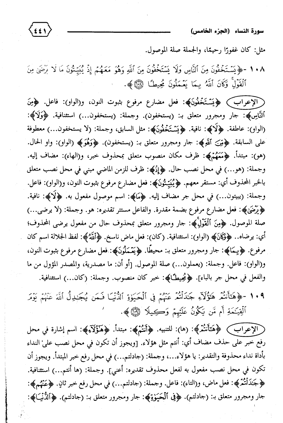١٠٨ - {يَسْتَخْفُونَ مِنَ النّاسِ وَلا يَسْتَخْفُونَ مِنَ اللهِ وَهُوَ مَعَهُمْ إِذْ يُبَيِّتُونَ ما لا يَرْضى مِنَ الْقَوْلِ وَكانَ اللهُ بِما يَعْمَلُونَ مُحِيطاً (١٠٨)}