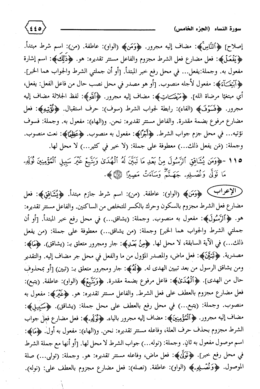 مصدرية. {تَبَيَّنَ}: فعل ماض، والمصدر المؤول من ما والفعل في محل جر مضاف إليه. والتقدير ومن يشاقق الرسول من بعد تبيين الهدى له. {لَهُ}: جار ومجرور متعلق ب: (تبين) [أو بمحذوف حال من الهدى]. {الْهُدى}: فاعل مرفوع بضمة مقدرة. {وَيَتَّبِعْ} (الواو): عاطفة. (يتبع):
