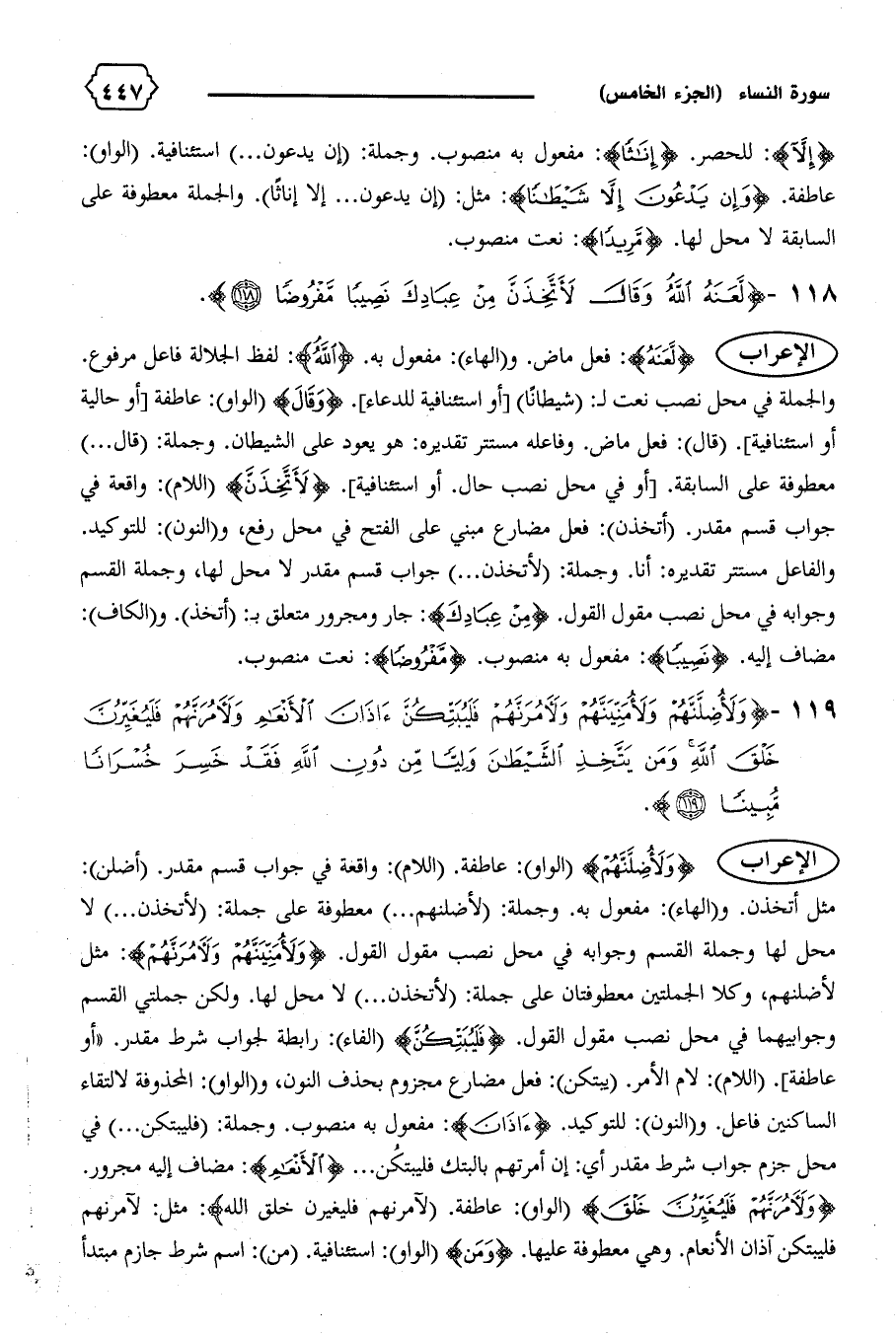 مثل أتخذن. و (الهاء): مفعول به. وجملة: (لأضلنهم ... ) معطوفة على جملة: (لأتخذن ... ) لا محل لها وجملة القسم وجوابه في محل نصب مقول القول. {وَلَأُمَنِّيَنَّهُمْ وَلَآمُرَنَّهُمْ}: مثل لأضلنهم، وكلا الجملتين معطوفتان على جملة: (لأتخذن ... ) لا محل لها. ولكن جملتي القسم وجوابيهما في محل نصب مقول القول. {فَلَيُبَتِّكُنَّ} (الفاء): رابطة لجواب شرط مقدر. «أو عاطفة]. (اللام): لام الأمر. (يبتكن): فعل مضارع مجزوم بحذف النون، و (الواو): المحذوفة لالتقاء الساكنين فاعل. و (النون): للتوكيد. {آذانَ}: مفعول به منصوب. وجملة: (فليبتكن ... ) في محل جزم جواب شرط مقدر أي: إن أمرتهم بالبتك فليبتكن ... {الْأَنْعامِ}: مضاف إليه مجرور.